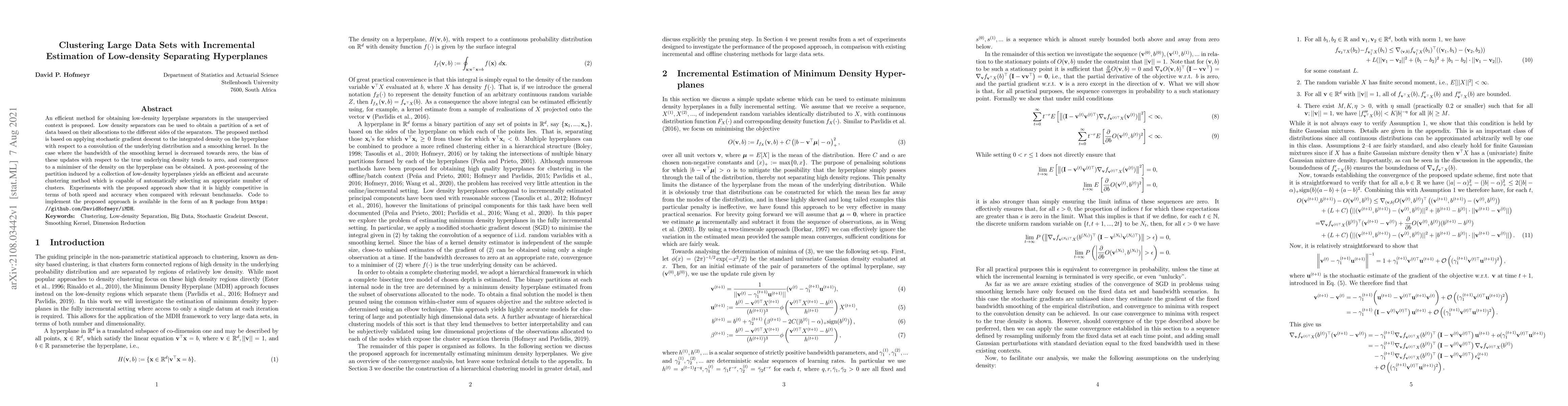 An efficient method for obtaining low-density hyperplane separators in the unsupervised context is proposed. Low density separators can be used to obtain a partition of a set of data based on their allocations to the different sides of the separators. The proposed method is based on applying stochastic gradient descent to the integrated density on the hyperplane with respect to a convolution of the underlying distribution and a smoothing kernel. In the case where the bandwidth of the smoothing kernel is decreased towards zero, the bias of these updates with respect to the true underlying density tends to zero, and convergence to a minimiser of the density on the hyperplane can be obtained. A post-processing of the partition induced by a collection of low-density hyperplanes yields an efficient and accurate clustering method which is capable of automatically selecting an appropriate number of clusters. Experiments with the proposed approach show that it is highly competitive in terms of both speed and accuracy when compared with relevant benchmarks. Code to implement the proposed approach is available in the form of an R package from https://github.com/DavidHofmeyr/iMDH.