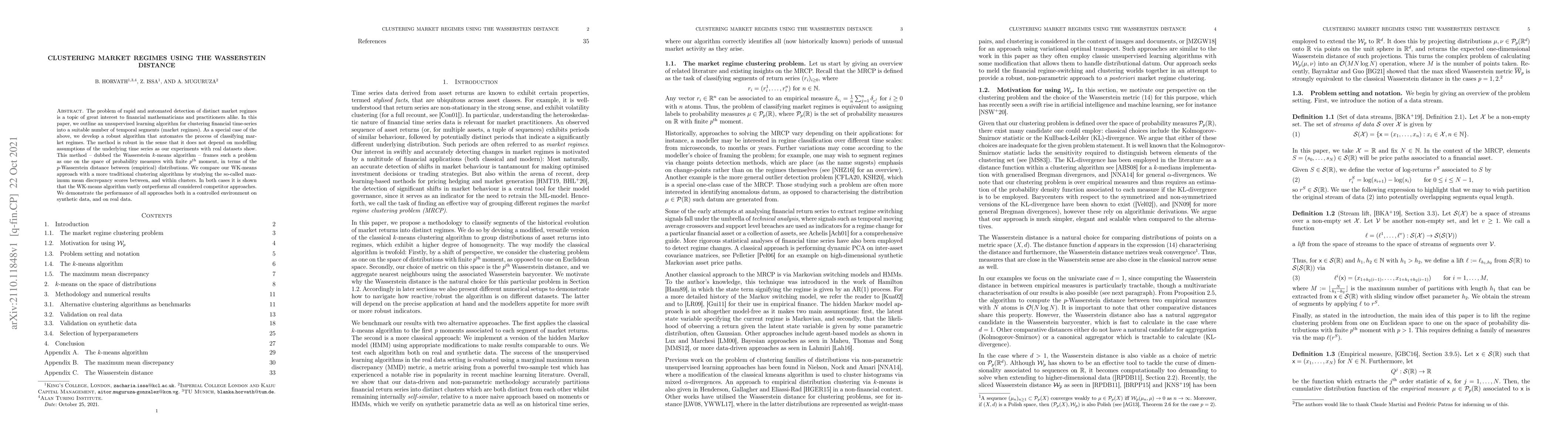 This paper proposes an unsupervised learning algorithm, the Wasserstein $k$-means (WK-means) algorithm, for clustering financial time-series into market regimes. The method outperforms traditional clustering algorithms in both synthetic and real datasets, demonstrating robustness without reliance on underlying time-series assumptions.