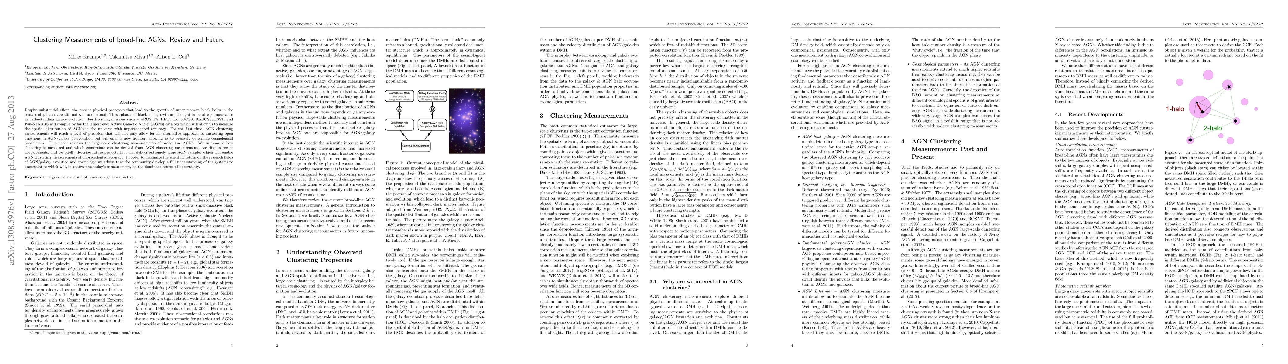 Despite substantial effort, the precise physical processes that lead to the growth of super-massive black holes in the centers of galaxies are still not well understood. These phases of black hole growth are thought to be of key importance in understanding galaxy evolution. Forthcoming missions such as eROSITA, HETDEX, eBOSS, BigBOSS, LSST, and Pan-STARRS will compile by far the largest ever Active Galactic Nuclei (AGNs) catalogs which will allow us to measure the spatial distribution of AGNs in the universe with unprecedented accuracy. For the first time, AGN clustering measurements will reach a level of precision that will not only allow for an alternative approach to answering open questions in AGN/galaxy co-evolution but will open a new frontier, allowing us to precisely determine cosmological parameters. This paper reviews the large-scale clustering measurements of broad line AGNs. We summarize how clustering is measured and which constraints can be derived from AGN clustering measurements, we discuss recent developments, and we briefly describe future projects that will deliver extremely large AGN samples which will enable AGN clustering measurements of unprecedented accuracy. In order to maximize the scientific return on the research fields of AGN/galaxy evolution and cosmology, we advise that the community develop a full understanding of the systematic uncertainties which will, in contrast to today's measurement, be the dominant source of uncertainty.