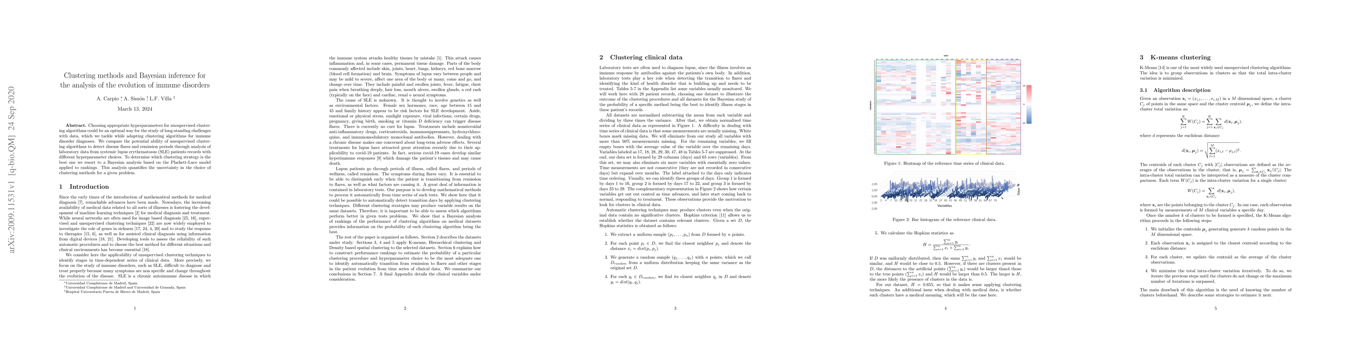 Choosing appropriate hyperparameters for unsupervised clustering algorithms in an optimal way depending on the problem under study is a long standing challenge, which we tackle while adapting clustering algorithms for immune disorder diagnoses. We compare the potential ability of unsupervised clustering algorithms to detect disease flares and remission periods through analysis of laboratory data from systemic lupus erythematosus patients records with different hyperparameter choices. To determine which clustering strategy is the best one we resort to a Bayesian analysis based on the Plackett-Luce model applied to rankings. This analysis quantifies the uncertainty in the choice of clustering methods for a given problem