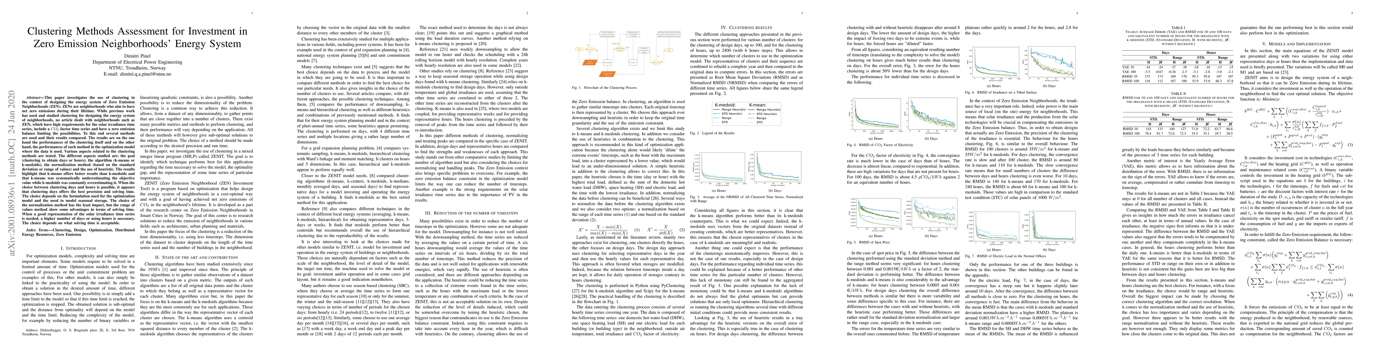 This paper evaluates various clustering methods for designing the energy system of Zero Emission Neighborhoods (ZEN), focusing on solar irradiance and CO2 factors. Results show k-means outperforms k-medoids, while clustering days generally yields better precision and solving time compared to hours. The choice of normalization method has the least impact, with range-based normalization showing slight advantages in solving time.