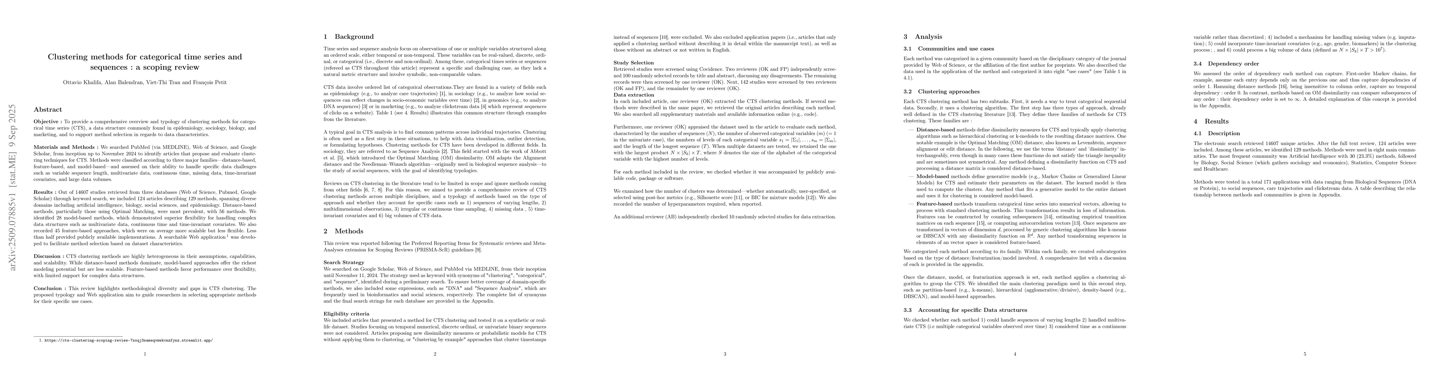Objective: To provide an overview of clustering methods for categorical time series (CTS), a data structure commonly found in epidemiology, sociology, biology, and marketing, and to support method selection in regards to data characteristics. Methods: We searched PubMed, Web of Science, and Google Scholar, from inception up to November 2024 to identify articles that propose and evaluate clustering techniques for CTS. Methods were classified according to three major families -- distance-based, feature-based, and model-based -- and assessed on their ability to handle data challenges such as variable sequence length, multivariate data, continuous time, missing data, time-invariant covariates, and large data volumes. Results: Out of 14607 studies, we included 124 articles describing 129 methods, spanning domains such as artificial intelligence, social sciences, and epidemiology. Distance-based methods, particularly those using Optimal Matching, were most prevalent, with 56 methods. We identified 28 model-based methods, which demonstrated superior flexibility for handling complex data structures such as multivariate data, continuous time and time-invariant covariates. We also recorded 45 feature-based approaches, which were on average more scalable but less flexible. A searchable Web application was developed to facilitate method selection based on dataset characteristics ( https://cts-clustering-scoping-review-7sxqj3sameqvmwkvnzfynz.streamlit.app/ ) Discussion: While distance-based methods dominate, model-based approaches offer the richest modeling potential but are less scalable. Feature-based methods favor performance over flexibility, with limited support for complex data structures. Conclusion: This review highlights methodological diversity and gaps in CTS clustering. The proposed typology aims to guide researchers in selecting appropriate methods for their specific use cases.