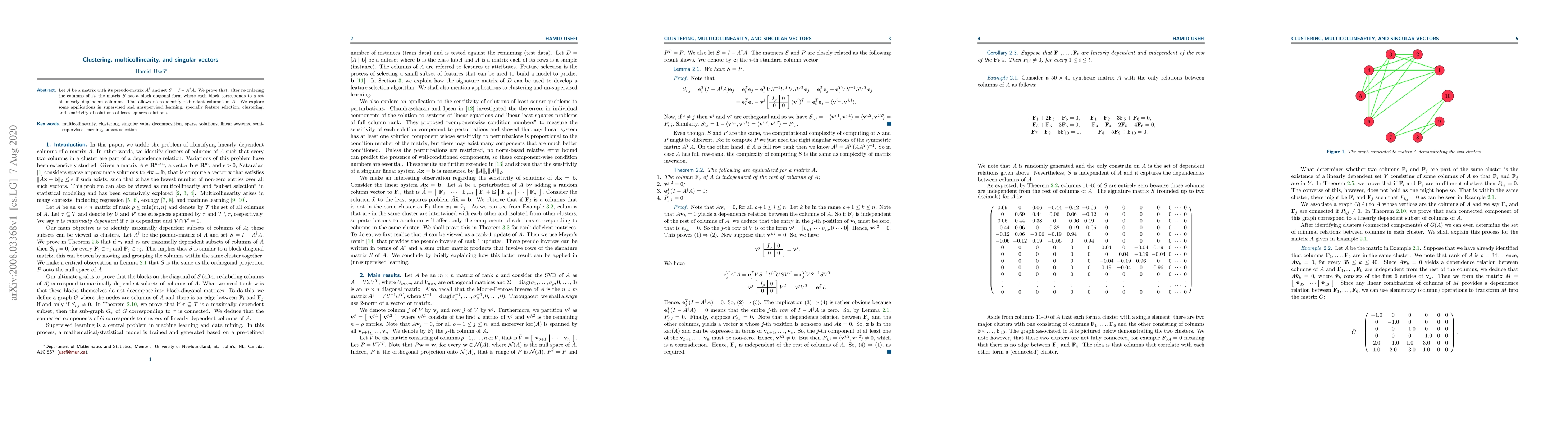 Let $A$ be a matrix with its pseudo-matrix $A^{\dagger}$ and set $S=I-A^{\dagger}A$. We prove that, after re-ordering the columns of $A$, the matrix $S$ has a block-diagonal form where each block corresponds to a set of linearly dependent columns. This allows us to identify redundant columns in $A$. We explore some applications in supervised and unsupervised learning, specially feature selection, clustering, and sensitivity of solutions of least squares solutions.