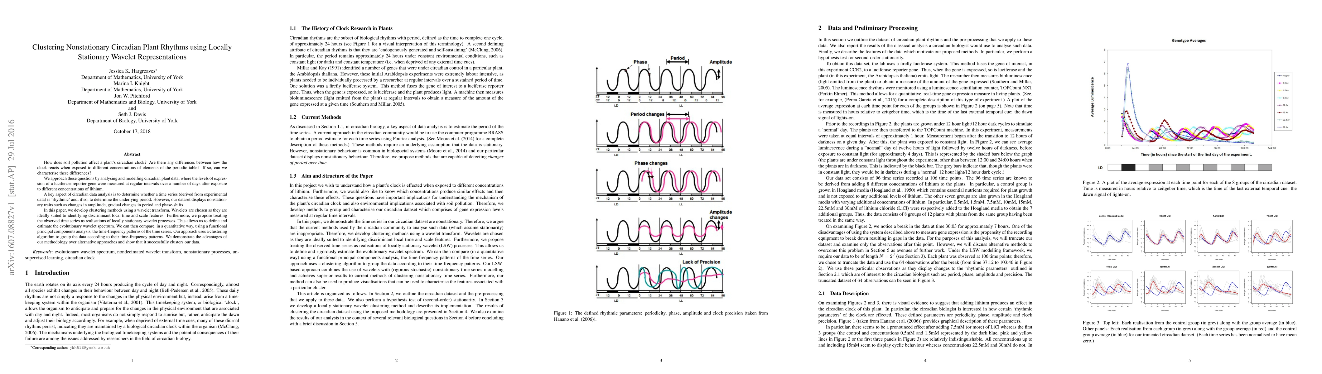 How does soil pollution affect a plant's circadian clock? Are there any differences between how the clock reacts when exposed to different concentrations of elements of the periodic table? If so, can we characterise these differences? We approach these questions by analysing and modelling circadian plant data, where the levels of expression of a luciferase reporter gene were measured at regular intervals over a number of days after exposure to different concentrations of lithium. A key aspect of circadian data analysis is to determine whether a time series (derived from experimental data) is `rhythmic' and, if so, to determine the underlying period. However, our dataset displays nonstationary traits such as changes in amplitude, gradual changes in period and phase-shifts. In this paper, we develop clustering methods using a wavelet transform. Wavelets are chosen as they are ideally suited to identifying discriminant local time and scale features. Furthermore, we propose treating the observed time series as realisations of locally stationary wavelet processes. This allows us to define and estimate the evolutionary wavelet spectrum. We can then compare, in a quantitative way, using a functional principal components analysis, the time-frequency patterns of the time series. Our approach uses a clustering algorithm to group the data according to their time-frequency patterns. We demonstrate the advantages of our methodology over alternative approaches and show that it successfully clusters our data.