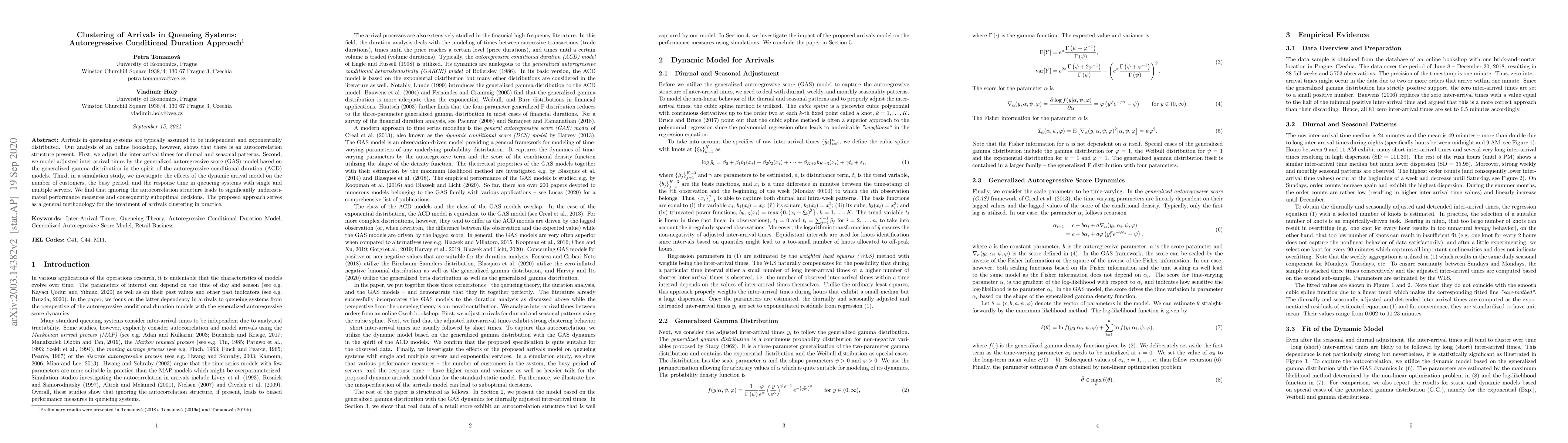 Arrivals in queueing systems are typically assumed to be independent and exponentially distributed. Our analysis of an online bookshop, however, shows that there is an autocorrelation structure present. First, we adjust the inter-arrival times for diurnal and seasonal patterns. Second, we model adjusted inter-arrival times by the generalized autoregressive score (GAS) model based on the generalized gamma distribution in the spirit of the autoregressive conditional duration (ACD) models. Third, in a simulation study, we investigate the effects of the dynamic arrival model on the number of customers, the busy period, and the response time in queueing systems with single and multiple servers. We find that ignoring the autocorrelation structure leads to significantly underestimated performance measures and consequently suboptimal decisions. The proposed approach serves as a general methodology for the treatment of arrivals clustering in practice.