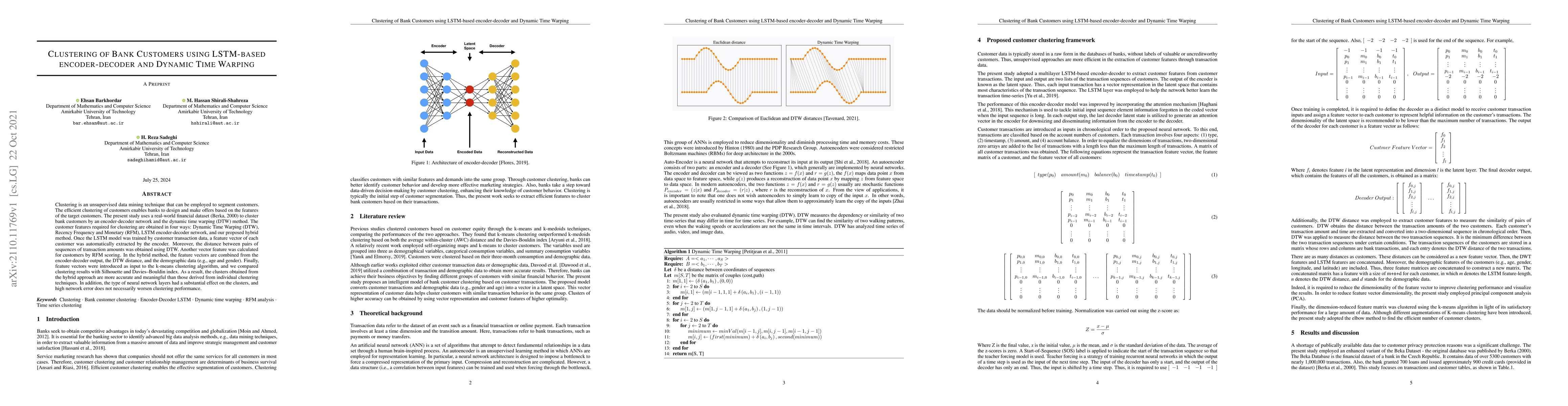 This study clusters bank customers using an LSTM-based encoder-decoder network combined with Dynamic Time Warping (DTW) for sequence alignment. The hybrid method, integrating DTW, RFM scoring, and demographic data, yields more accurate and meaningful clusters compared to individual techniques, as evaluated by the Silhouette and Davies-Bouldin indices.