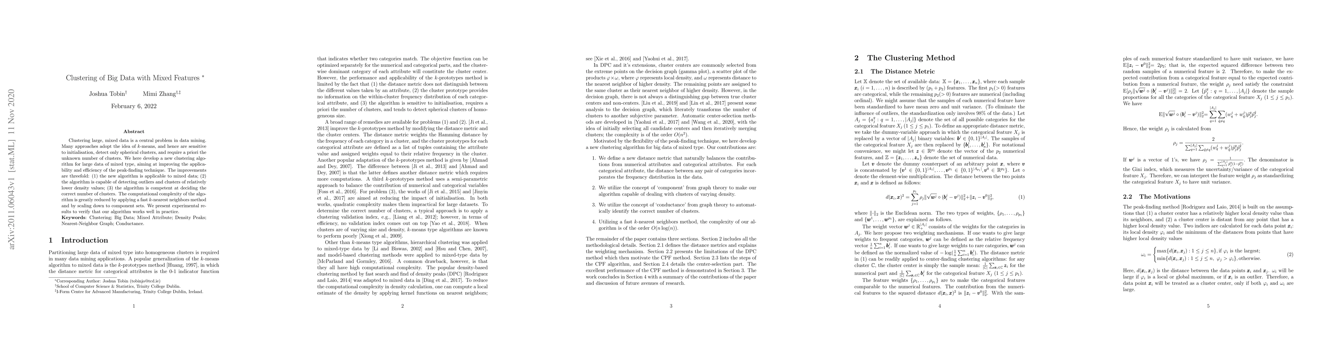 Clustering large, mixed data is a central problem in data mining. Many approaches adopt the idea of k-means, and hence are sensitive to initialisation, detect only spherical clusters, and require a priori the unknown number of clusters. We here develop a new clustering algorithm for large data of mixed type, aiming at improving the applicability and efficiency of the peak-finding technique. The improvements are threefold: (1) the new algorithm is applicable to mixed data; (2) the algorithm is capable of detecting outliers and clusters of relatively lower density values; (3) the algorithm is competent at deciding the correct number of clusters. The computational complexity of the algorithm is greatly reduced by applying a fast k-nearest neighbors method and by scaling down to component sets. We present experimental results to verify that our algorithm works well in practice. Keywords: Clustering; Big Data; Mixed Attribute; Density Peaks; Nearest-Neighbor Graph; Conductance.