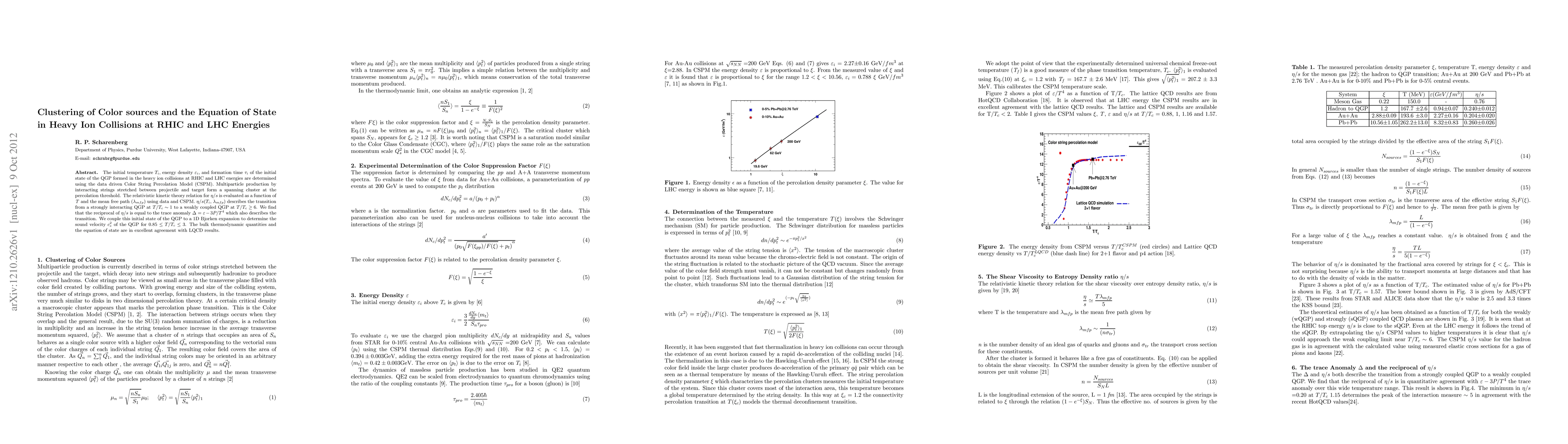 The initial temperature $T_{i}$, energy density $\varepsilon_{i}$, and formation time $\tau_{i}$ of the initial state of the QGP formed in the heavy ion collisions at RHIC and LHC energies are determined using the data driven Color String Percolation Model (CSPM). Multiparticle production by interacting strings stretched between projectile and target form a spanning cluster at the percolation threshold. The relativistic kinetic theory relation for $\eta/s$ is evaluated as a function of $\it T$ and the mean free path ($\lambda_{mfp}$) using data and CSPM. $\eta/s$($T_{i}$, $\lambda_{mfp}$) describes the transition from a strongly interacting QGP at $T/T_{c} \sim 1$ to a weakly coupled QGP at $T/T_{c} \ge 6$. We find that the reciprocal of $\eta/s$ is equal to the trace anomaly $\Delta = \varepsilon-3P/T^{4}$ which also describes the transition. We couple this initial state of the QGP to a 1D Bjorken expansion to determine the sound velocity $c_{s}^{2}$ of the QGP for 0.85 $\le T/T_{c} \leq 3$. The bulk thermodynamic quantities and the equation of state are in excellent agreement with LQCD results.