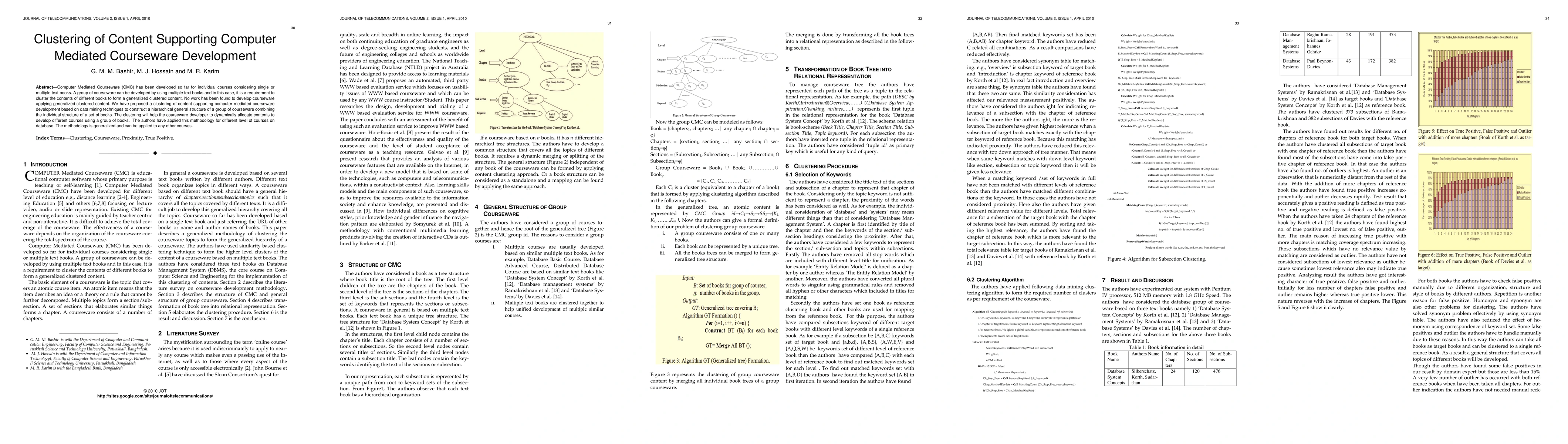 Computer Mediated Courseware (CMC) has been developed so far for individual courses considering single or multiple text books. A group of courseware can be developed by using multiple text books and in this case, it is a requirement to cluster the contents of different books to form a generalized clustered content. No work has been found to develop courseware applying generalized clustered content. We have proposed a clustering of content supporting computer mediated courseware development based on data mining techniques to construct a hierarchical general structure of a group of courseware combining the individual structure of a set of books. The clustering will help the courseware developer to dynamically allocate contents to develop different courses using a group of books. The authors have applied this methodology for different level of courses on database. The methodology is generalized and can be applied to any other courses.