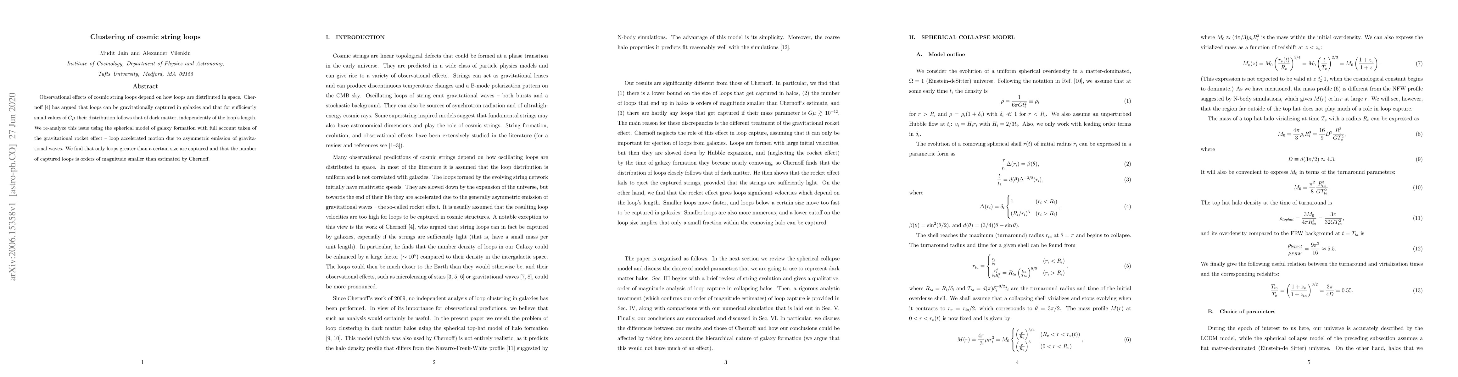 Observational effects of cosmic string loops depend on how loops are distributed in space. Chernoff \cite{Chernoff} has argued that loops can be gravitationally captured in galaxies and that for sufficiently small values of $G\mu$ their distribution follows that of dark matter, independently of the loop's length. We re-analyze this issue using the spherical model of galaxy formation with full account taken of the gravitational rocket effect -- loop accelerated motion due to asymmetric emission of gravitational waves. We find that only loops greater than a certain size are captured and that the number of captured loops is orders of magnitude smaller than estimated by Chernoff.