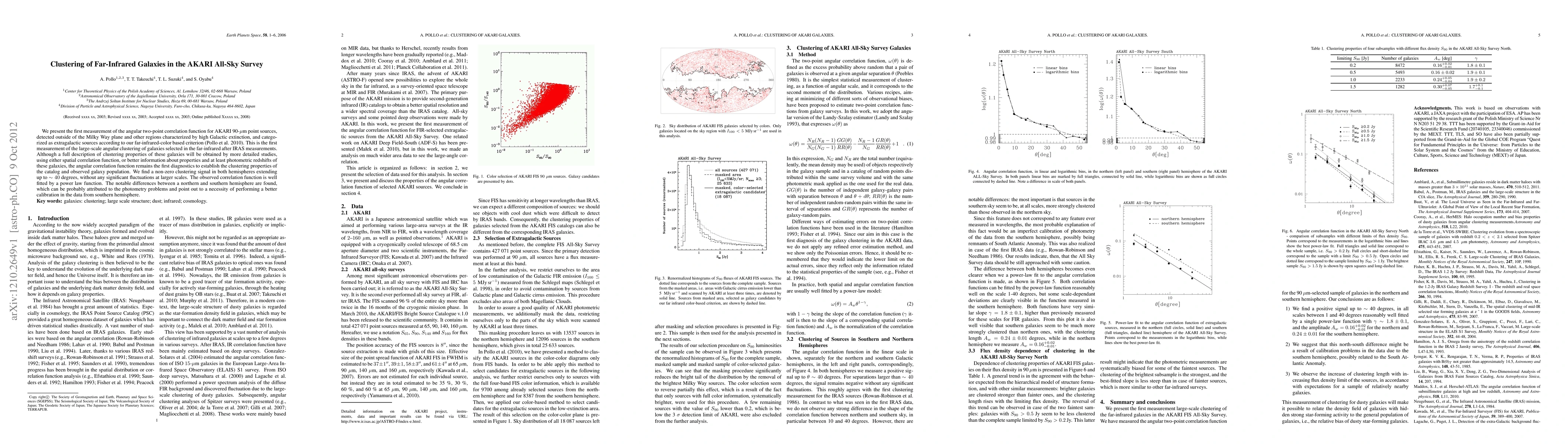 We present the first measurement of the angular two-point correlation function for AKARI 90-$\mu$m point sources, detected outside of the Milky Way plane and other regions characterized by high Galactic extinction, and categorized as extragalactic sources according to our far-infrared-color based criterion (Pollo et al. 2010). This is the first measurement of the large-scale angular clustering of galaxies selected in the far-infrared after IRAS measurements. Although a full description of clustering properties of these galaxies will be obtained by more detailed studies, using either spatial correlation function, or better information about properties and at least photometric redshifts of these galaxies, the angular correlation function remains the first diagnostics to establish the clustering properties of the catalog and observed galaxy population. We find a non-zero clustering signal in both hemispheres extending up to $\sim 40$ degrees, without any significant fluctuations at larger scales. The observed correlation function is well fitted by a power law function. The notable differences between a northern and southern hemisphere are found, which can be probably attributed to the photometry problems and point out to a necessity of performing a better calibration in the data from southern hemisphere.