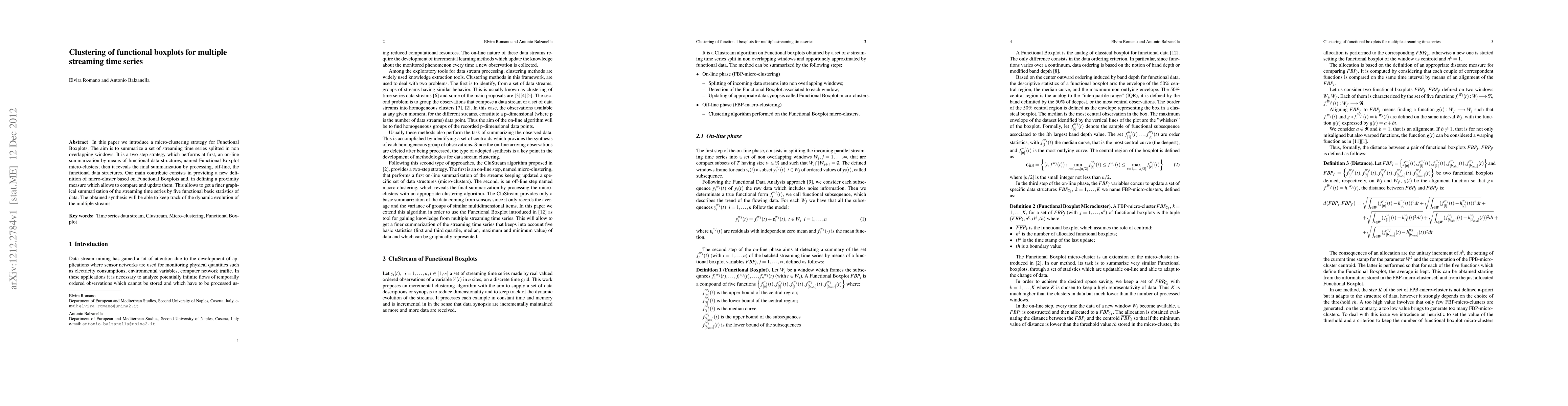 This paper proposes a micro-clustering strategy for summarizing streaming time series using Functional Boxplots, involving an online summarization phase and an offline processing phase. The key contribution is a new micro-cluster definition based on Functional Boxplots and a proximity measure for comparison and updates, enabling finer graphical summarization and dynamic evolution tracking.
