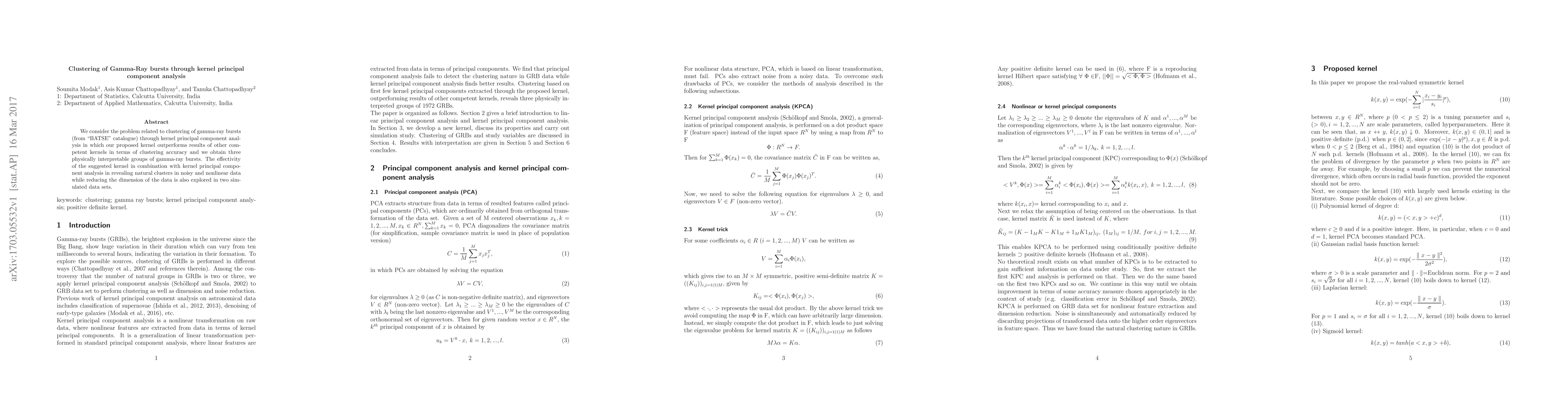 We consider the problem related to clustering of gamma-ray bursts (from "BATSE" catalogue) through kernel principal component analysis in which our proposed kernel outperforms results of other competent kernels in terms of clustering accuracy and we obtain three physically interpretable groups of gamma-ray bursts. The effectivity of the suggested kernel in combination with kernel principal component analysis in revealing natural clusters in noisy and nonlinear data while reducing the dimension of the data is also explored in two simulated data sets.