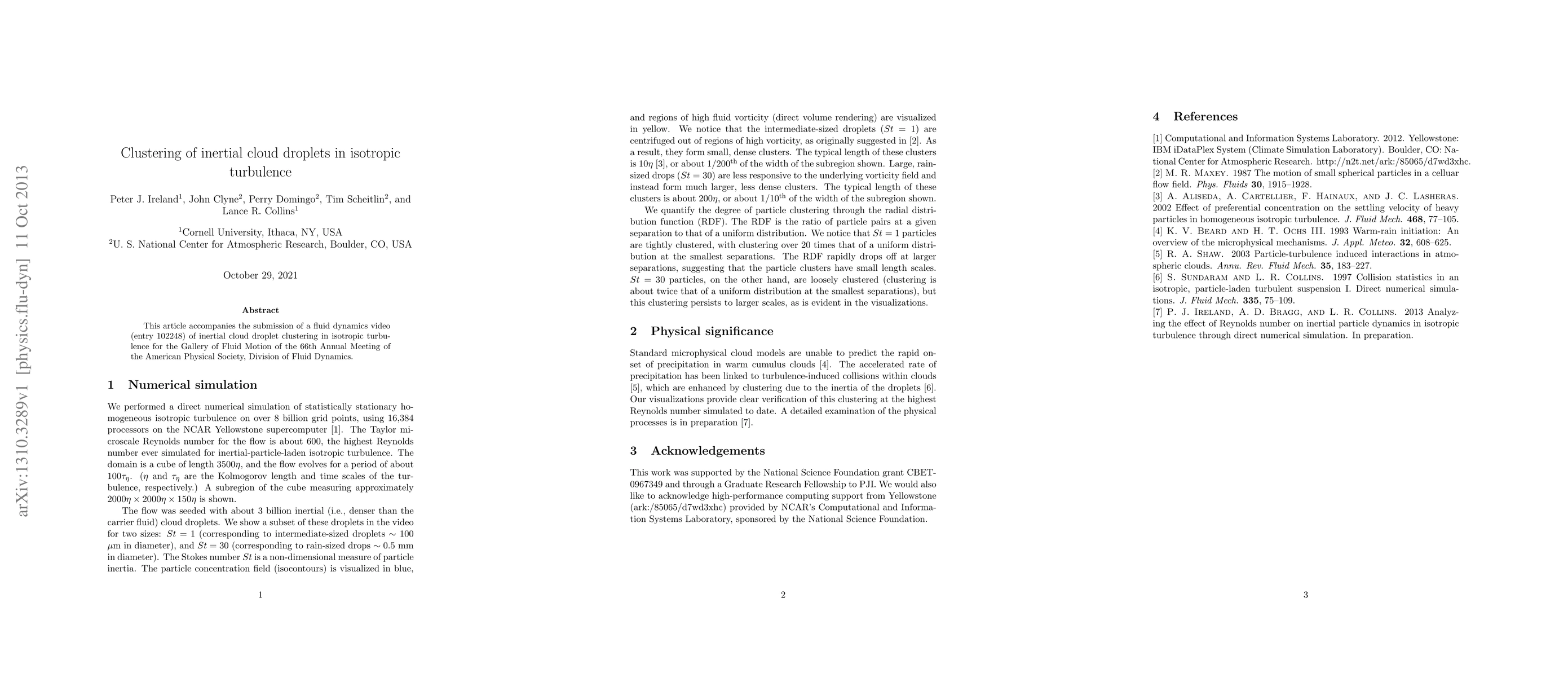 This article accompanies the submission of a fluid dynamics video (entry 102248) of inertial cloud droplet clustering in isotropic turbulence for the Gallery of Fluid Motion of the 66th Annual Meeting of the American Physical Society, Division of Fluid Dynamics.