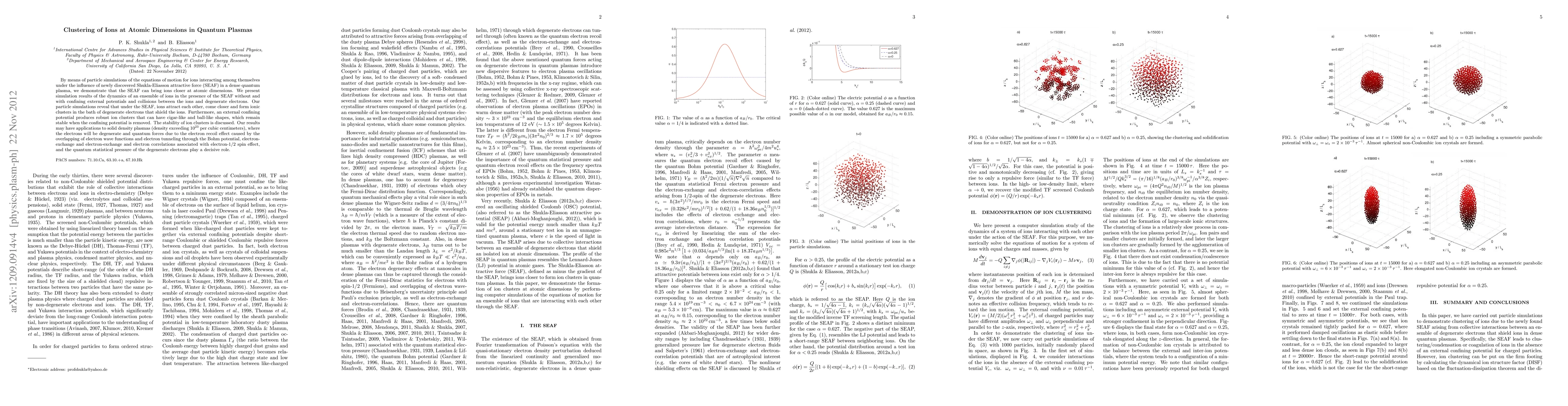 This paper uses particle simulations to show that the Shukla-Eliasson attractive force (SEAF) can cause ions in a dense quantum plasma to cluster at atomic dimensions. The study reveals that ion clusters can form cigar-like and ball-like shapes under external potentials, which remain stable even when the potential is removed.