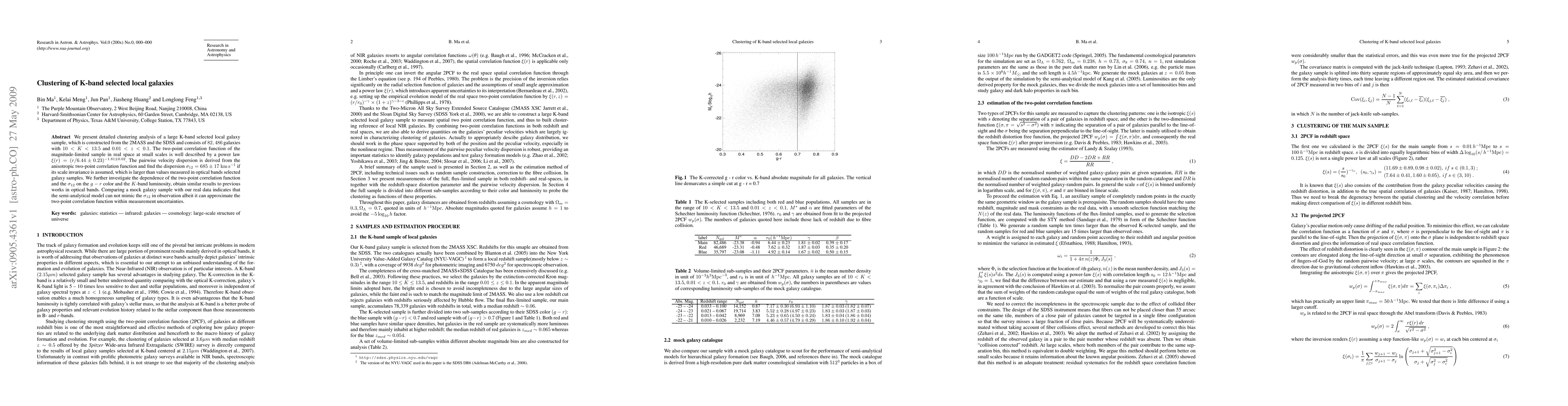 We present detailed clustering analysis of a large K-band selected local galaxy sample, which is constructed from the 2MASS and the SDSS and consists of $82,486$ galaxies with $10 < K < 13.5$ and $0.01 < z < 0.1$. The two-point correlation function of the magnitude-limited sample in real space at small scales is well described by a power law $\xi(r)=(r/6.44\pm0.23)^{-1.81\pm0.02}$. The pairwise velocity dispersion is derived from the anisotropic two-point correlation function and find the dispersion $\sigma_{12}=685\pm 17\kms$ if its scale invariance is assumed, which is larger than values measured in optical bands selected galaxy samples. We further investigate the dependence of the two-point correlation function and the $\sigma_{12}$ on the $g-r$ color and the $K$-band luminosity, obtain similar results to previous works in optical bands. Comparing a mock galaxy sample with our real data indicates that the semi-analytical model can not mimic the $\sigma_{12}$ in observation albeit it can approximate the two-point correlation function within measurement uncertainties.