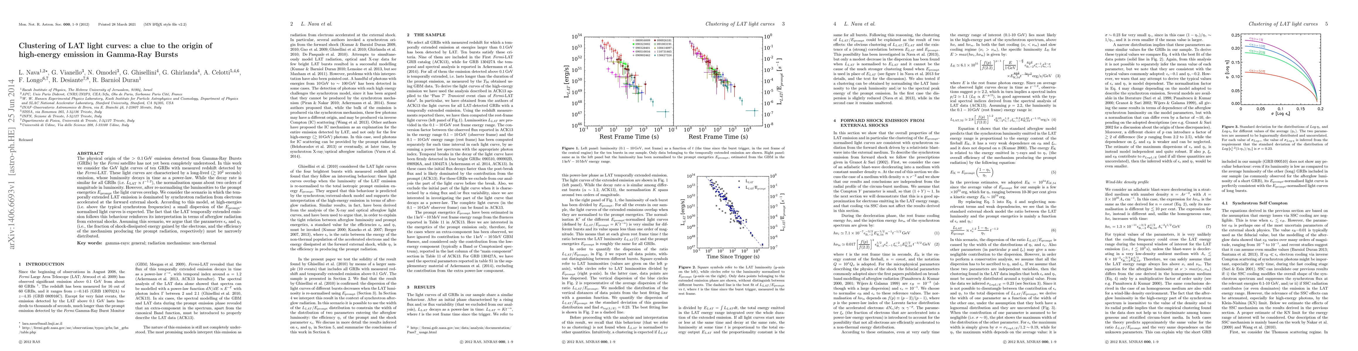 The physical origin of the >0.1 GeV emission detected from Gamma-Ray Bursts (GRBs) by the Fermi satellite has not yet been completely understood. In this work we consider the GeV light curves of ten GRBs with measured redshift detected by the Fermi-LAT. These light curves are characterised by a long-lived ($\gtrsim10^2$ seconds) emission, whose luminosity decays in time as a power-law. While the decay rate is similar for all GRBs (i.e. $L_{LAT}\propto t^{-1.2}$), the normalisation spans about two orders of magnitude in luminosity. However, after re-normalising the luminosities to the prompt energetics $E_{iso}$ the light curves overlap. We consider the scenario in which the temporally extended LAT emission is dominated by synchrotron radiation from electrons accelerated at the forward external shock. According to this model, at high-energies (i.e. above the typical synchrotron frequencies) a small dispersion of the $E_{iso}$-normalised light curves is expected. The fact that the LAT temporally extended emission follows this behaviour reinforces its interpretation in terms of afterglow radiation from external shocks. Assuming this scenario, we argue that the parameters $\epsilon_e$ and $\eta_\gamma$ (i.e., the fraction of shock-dissipated energy gained by the electrons, and the efficiency of the mechanism producing the prompt radiation, respectively) must be narrowly distributed.