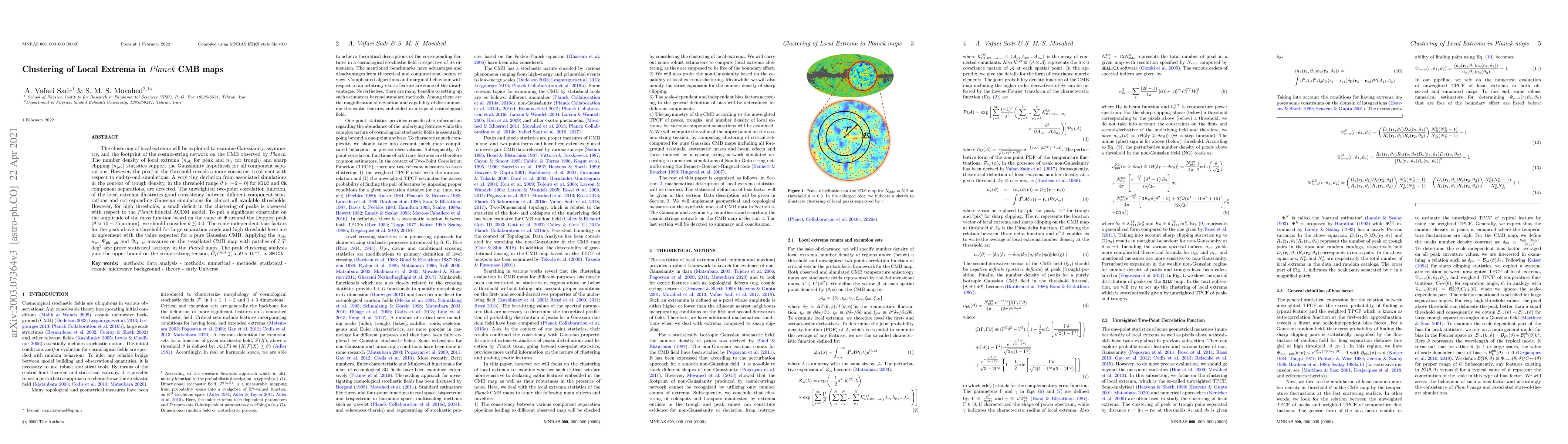 This paper investigates the clustering of local extrema in Planck CMB maps to test Gaussianity, asymmetry, and cosmic-string signatures. The analysis supports Gaussianity but detects slight deviations in trough density and a small deficit in peak clustering at high thresholds, suggesting an upper bound on cosmic-string tension of $G\mu^{(\rm up)} \lesssim 5.59\times 10^{-7}$.