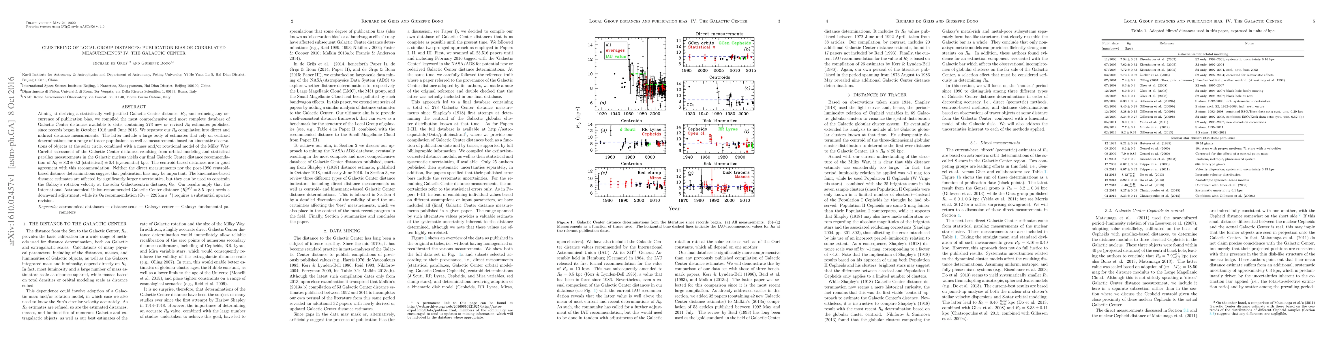 Aiming at deriving a statistically well-justified Galactic Center distance, $R_0$, and reducing any occurrence of publication bias, we compiled the most comprehensive and most complete database of Galactic Center distances available to date, containing 273 new or revised $R_0$ estimates published since records began in October 1918 until June 2016. We separate our $R_0$ compilation into direct and indirect distance measurements. The latter include a large body of estimates that rely on centroid determinations for a range of tracer populations as well as measurements based on kinematic observations of objects at the solar circle, combined with a mass and/or rotational model of the Milky Way. Careful assessment of the Galactic Center distances resulting from orbital modeling and statistical parallax measurements in the Galactic nucleus yields our final Galactic Center distance recommendation of $R_0 = 8.3 \pm 0.2 \mbox{ (statistical)} \pm 0.4 \mbox{ (systematic)}$ kpc. The centroid-based distances are in good agreement with this recommendation. Neither the direct measurements nor the post-1990 centroid-based distance determinations suggest that publication bias may be important. The kinematics-based distance estimates are affected by significantly larger uncertainties, but they can be used to constrain the Galaxy's rotation velocity at the solar Galactocentric distance, $\Theta_0$. Our results imply that the International Astronomical Union-recommended Galactic Center distance ($R_0^{\rm IAU} = 8.5$ kpc) needs a downward adjustment, while its $\Theta_0$ recommendation ($\Theta_0 = 220$ km s$^{-1}$) requires a substantial upward revision.