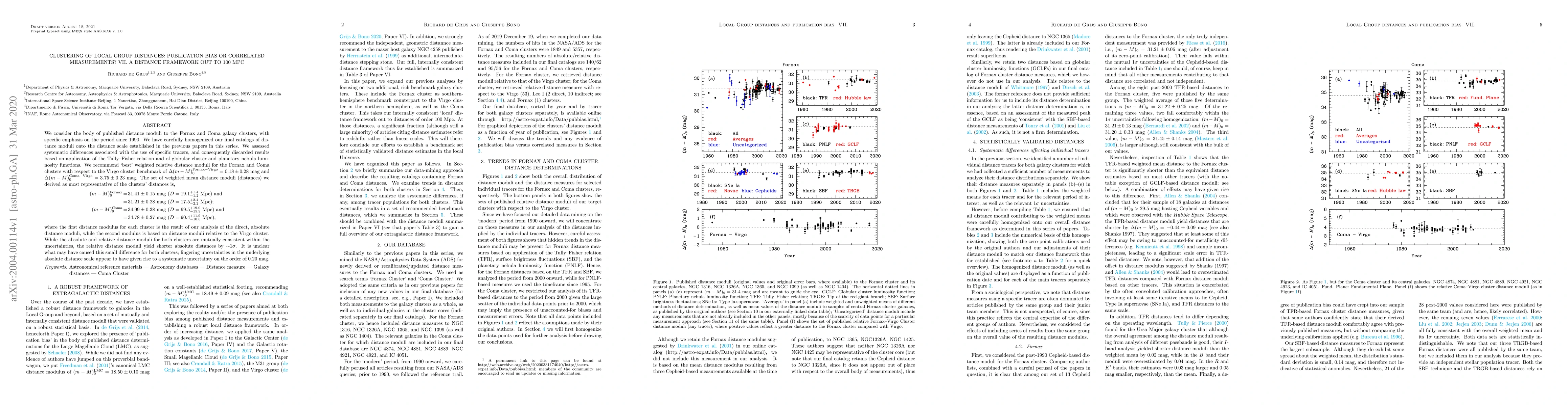 We consider the published distance moduli to the Fornax and Coma galaxy clusters, with emphasis on the period since 1990. We have carefully homogenized our catalogs of distance moduli onto the distance scale established in the previous papers in this series. We assessed systematic differences associated with the use of specific tracers, and discarded results based on application of the Tully--Fisher relation and of globular cluster and planetary nebula luminosity functions. We recommend `best' weighted relative distance moduli for the Fornax and Coma clusters with respect to the Virgo cluster of $\Delta (m-M)_0^{\rm Fornax - Virgo} = 0.18 \pm 0.28 $ mag and $\Delta (m-M)_0^{\rm Coma - Virgo} = 3.75 \pm 0.23$ mag. The set of weighted mean distance moduli (distances) we derived as most representative of the clusters' distances is, \begin{eqnarray} (m-M)_0^{\rm Fornax} &=& 31.41 \pm 0.15 \mbox{ mag } (D = 19.1^{+1.4}_{-1.2} \mbox{ Mpc) and} \nonumber &=& 31.21 \pm 0.28 \mbox{ mag } (D = 17.5^{+2.4}_{-2.2} \mbox{ Mpc)}; \nonumber \\ (m-M)_0^{\rm Coma} &=& 34.99 \pm 0.38 \mbox{ mag } (D = 99.5^{+19.0}_{-15.9} \mbox{ Mpc) and} \nonumber &=& 34.78 \pm 0.27 \mbox{ mag } (D = 90.4^{+11.9}_{-10.6} \mbox{ Mpc)}, \nonumber \end{eqnarray} where the first value for each cluster is the result of our analysis of the direct distance moduli, while the second modulus is based on distance moduli relative to the Virgo cluster. The absolute and relative distance moduli for both clusters are mutually consistent within the uncertainties; the relative distance moduli yield shorter distances by $\sim$1$\sigma$. Lingering uncertainties in the underlying absolute distance scale appear to have given rise to a systematic uncertainty on the order of 0.20 mag.