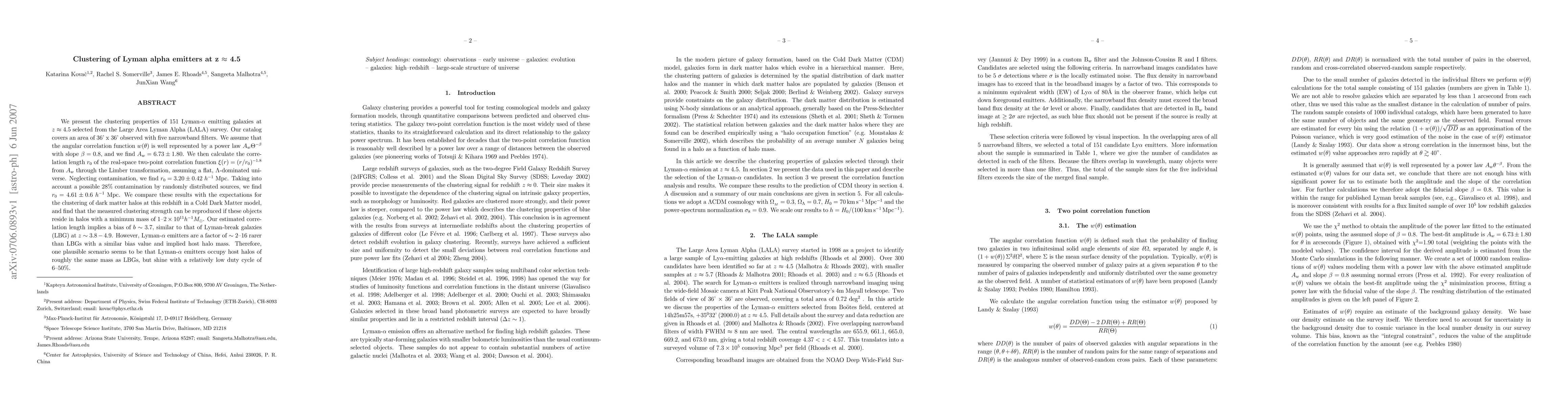 This paper investigates the clustering properties of 151 Lyman alpha emitting galaxies at z ~ 4.5, finding a correlation length of 3.20 Mpc/h, which increases to 4.61 Mpc/h when accounting for contamination. The study suggests these galaxies reside in dark matter halos with masses of 1-2 x 10^11 Solar masses/h.
