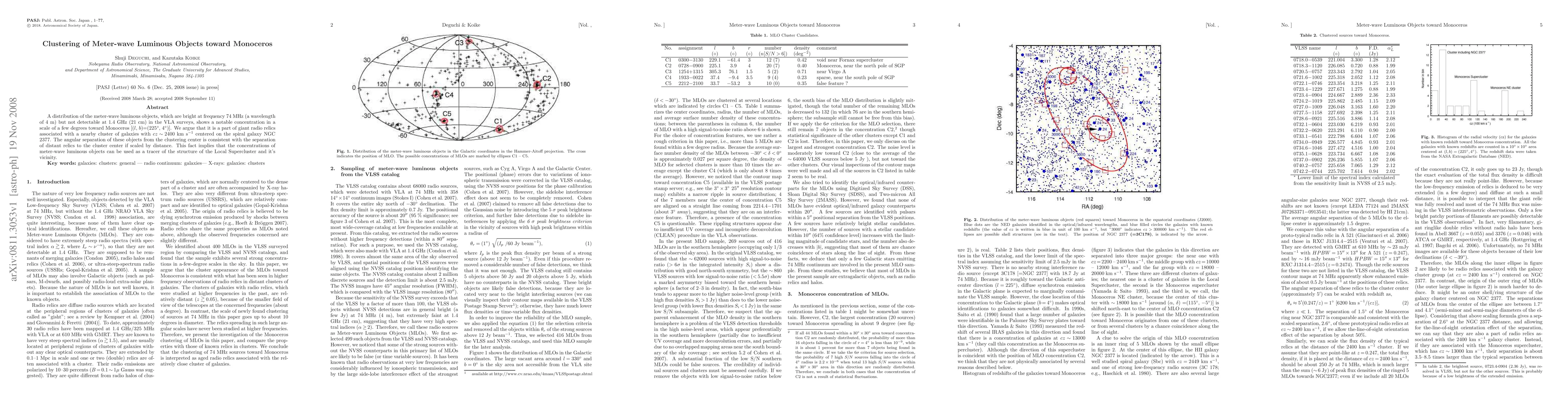 A distribution of the meter-wave luminous objects, which are bright at frequency 74 MHz (a wavelength of 4 m) but not detectable at 1.4 GHz (21 cm) in the VLA surveys, shows a notable concentration in a scale of a few degrees toward Monoceros [(l, b)=(225, 4)]. We argue that it is a part of giant radio relics associated with a nearby cluster of galaxies with cz~2400$ km s^{-1} centered on the spiral galaxy NGC 2377. The angular separation of these objects from the clustering center is consistent with the separation of distant relics to the cluster center if scaled by distance. This fact implies that the concentrations of meter-wave luminous objects can be used as a tracer of the structure of the Local Supercluster and it's vicinity.