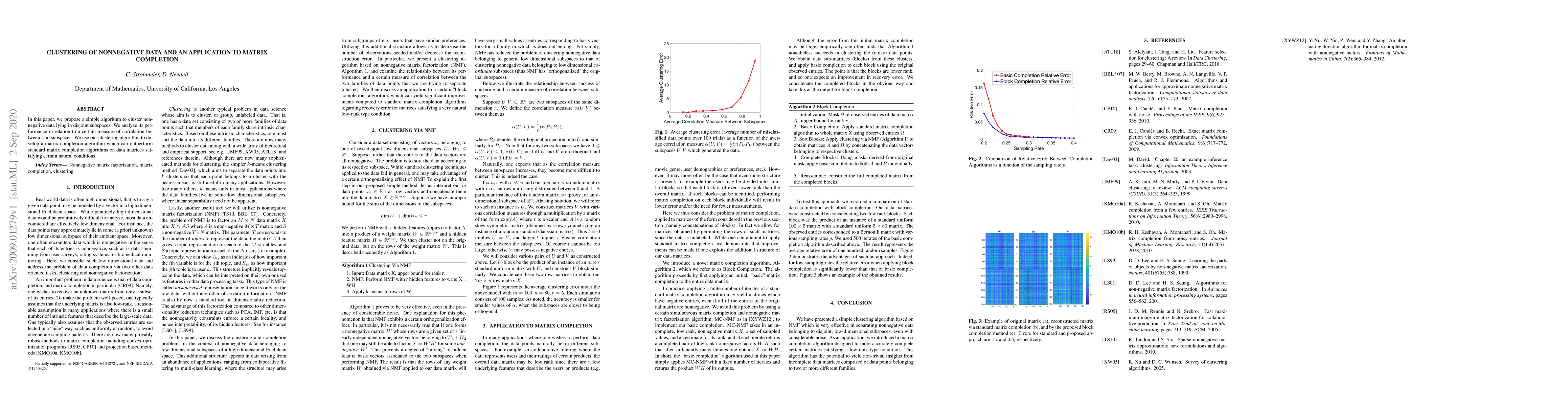 This paper introduces a clustering algorithm for nonnegative data in disjoint subspaces, analyzing its correlation-based performance. It applies this clustering to develop a matrix completion method that outperforms standard algorithms under specific conditions.