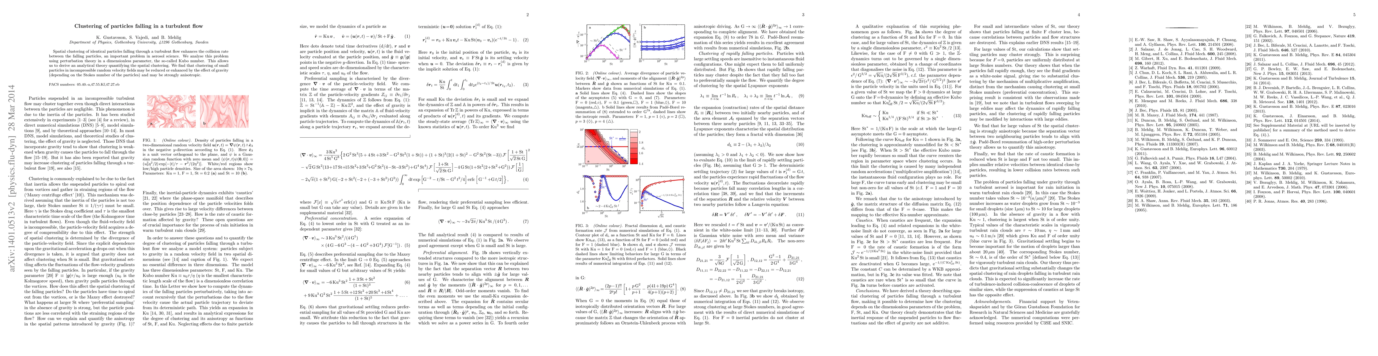 Spatial clustering of identical particles falling through a turbulent flow enhances the collision rate between the falling particles, an important problem in aerosol science. We analyse this problem using perturbation theory in a dimensionless parameter, the so-called Kubo number. This allows us to derive an analytical theory quantifying the spatial clustering. We find that clustering of small particles in incompressible random velocity fields may be reduced or enhanced by the effect of gravity (depending on the Stokes number of the particles) and may be strongly anisotropic.