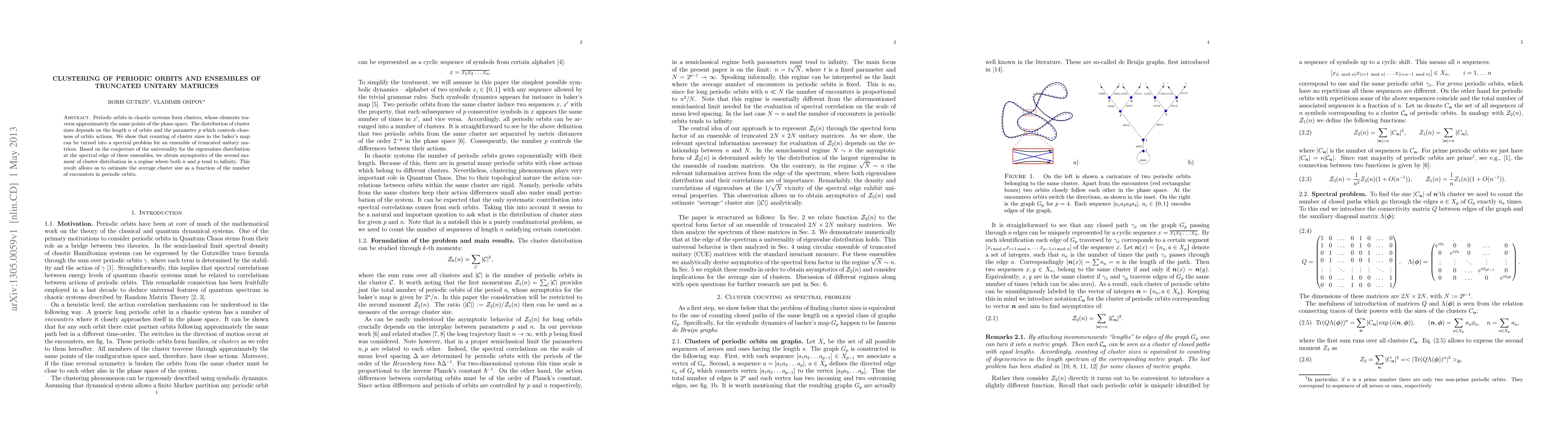 This paper explores the clustering of periodic orbits in chaotic systems and demonstrates that the distribution of cluster sizes can be linked to the spectral properties of an ensemble of truncated unitary matrices. It uses universality conjectures to derive the asymptotic behavior of cluster sizes, providing insights into the average size as a function of the number of encounters in periodic orbits.