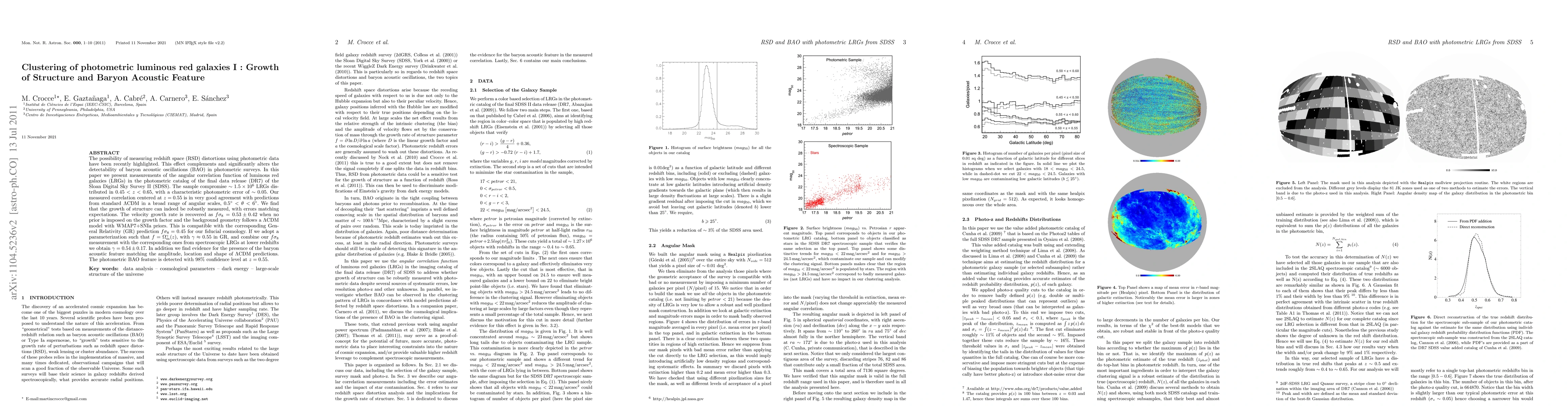 This paper measures the angular correlation function of luminous red galaxies (LRGs) in the SDSS DR7 photometric catalog, finding good agreement with LCDM predictions. The study confirms the growth of structure and detects the baryon acoustic feature with high confidence, supporting the robustness of redshift space distortions in photometric surveys.