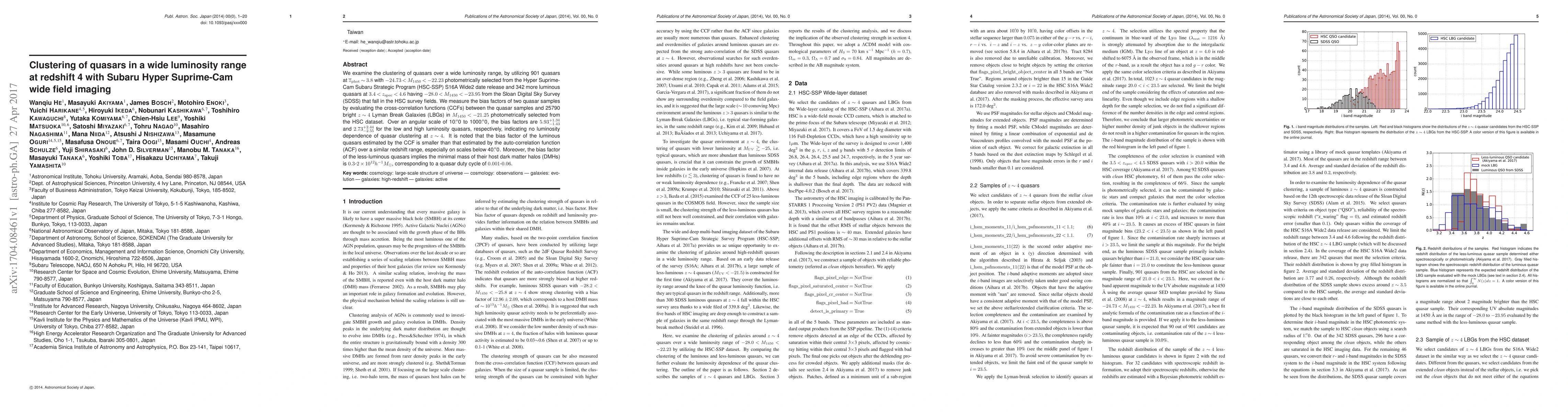 This study investigates the clustering of quasars across a wide luminosity range at redshift 4 using Subaru Hyper Suprime-Cam imaging. The analysis reveals no luminosity dependence in quasar clustering, with bias factors of 5.93 and 2.73 for low and high luminosity quasars, respectively.