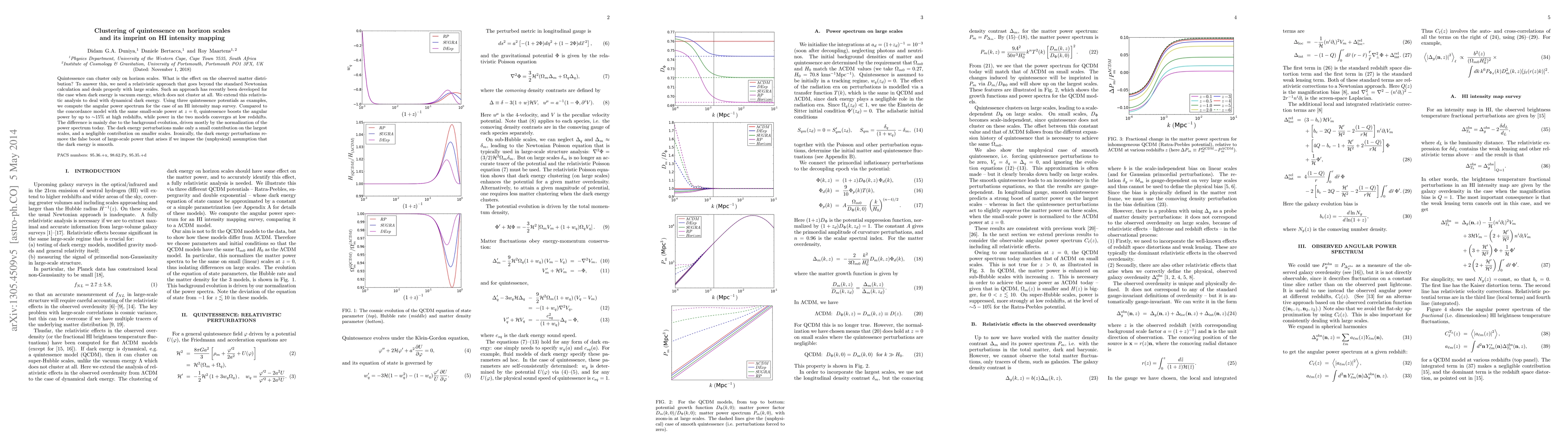 Quintessence can cluster only on horizon scales. What is the effect on the observed matter distribution? To answer this, we need a relativistic approach that goes beyond the standard Newtonian calculation and deals properly with large scales. Such an approach has recently been developed for the case when dark energy is vacuum energy, which does not cluster at all. We extend this relativistic analysis to deal with dynamical dark energy. Using three quintessence potentials as examples, we compute the angular power spectrum for the case of an HI intensity map survey. Compared to the concordance model with the same small-scale power at z=0, quintessence boosts the angular power by up to ~15% at high redshifts, while power in the two models converges at low redshifts. The difference is mainly due to the background evolution, driven mostly by the normalization of the power spectrum today. The dark energy perturbations make only a small contribution on the largest scales, and a negligible contribution on smaller scales. Ironically, the dark energy perturbations remove the false boost of large-scale power that arises if we impose the (unphysical) assumption that the dark energy is smooth.