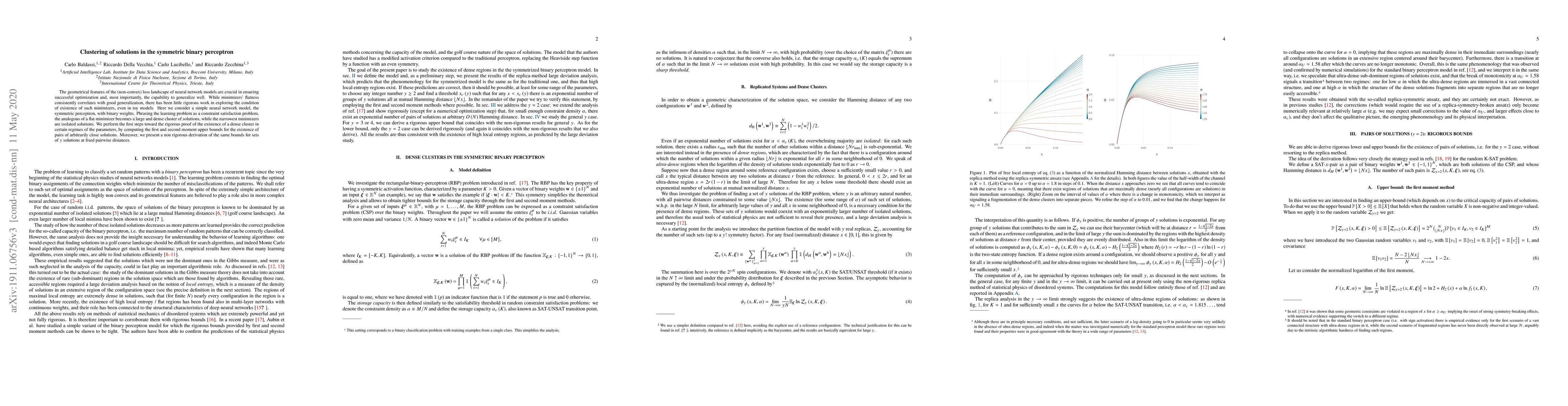 The geometrical features of the (non-convex) loss landscape of neural network models are crucial in ensuring successful optimization and, most importantly, the capability to generalize well. While minimizers' flatness consistently correlates with good generalization, there has been little rigorous work in exploring the condition of existence of such minimizers, even in toy models. Here we consider a simple neural network model, the symmetric perceptron, with binary weights. Phrasing the learning problem as a constraint satisfaction problem, the analogous of a flat minimizer becomes a large and dense cluster of solutions, while the narrowest minimizers are isolated solutions. We perform the first steps toward the rigorous proof of the existence of a dense cluster in certain regimes of the parameters, by computing the first and second moment upper bounds for the existence of pairs of arbitrarily close solutions. Moreover, we present a non rigorous derivation of the same bounds for sets of $y$ solutions at fixed pairwise distances.