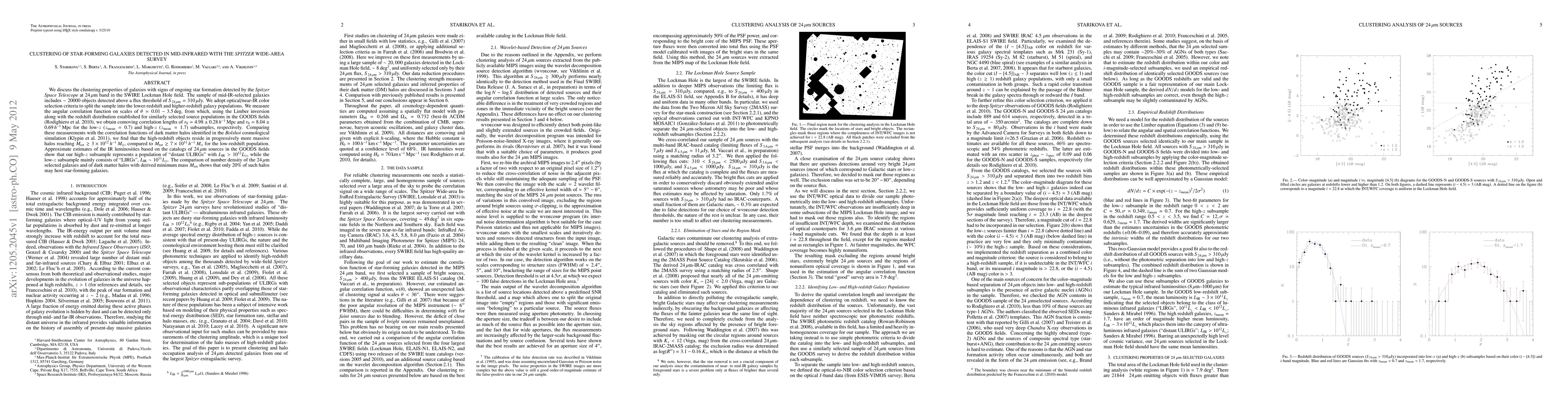 This paper investigates the clustering of star-forming galaxies in the mid-infrared detected by the Spitzer Space Telescope, finding distinct comoving correlation lengths for low- and high-redshift populations. High-redshift galaxies reside in more massive dark matter halos, suggesting they are distant ultra-luminous infrared galaxies.