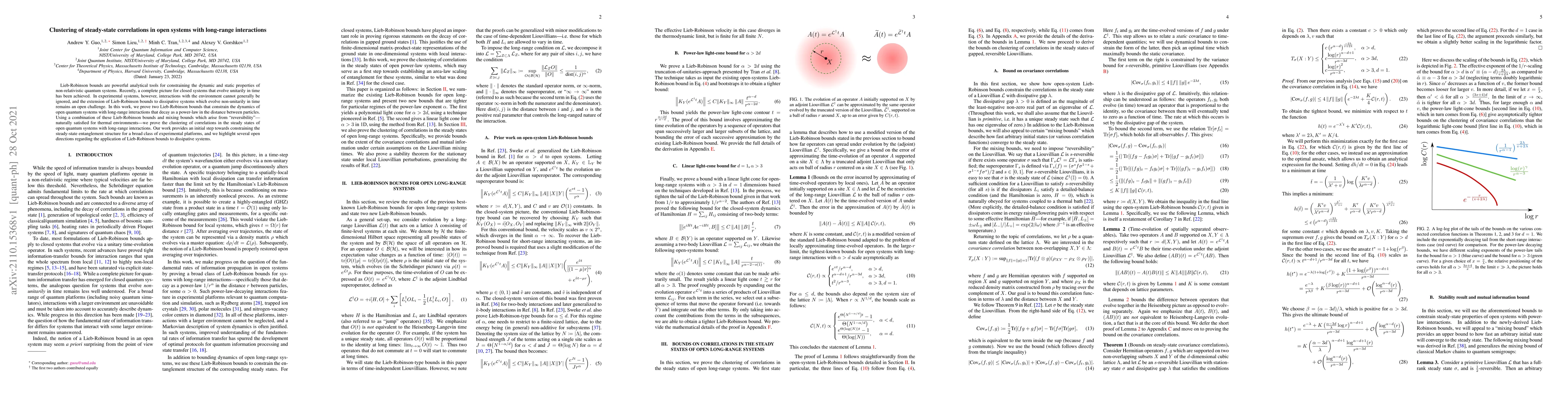 This paper establishes Lieb-Robinson bounds for open quantum systems with long-range interactions, demonstrating the clustering of steady-state correlations. It provides a foundational step towards understanding the entanglement structure in experimental systems that interact with their environments.