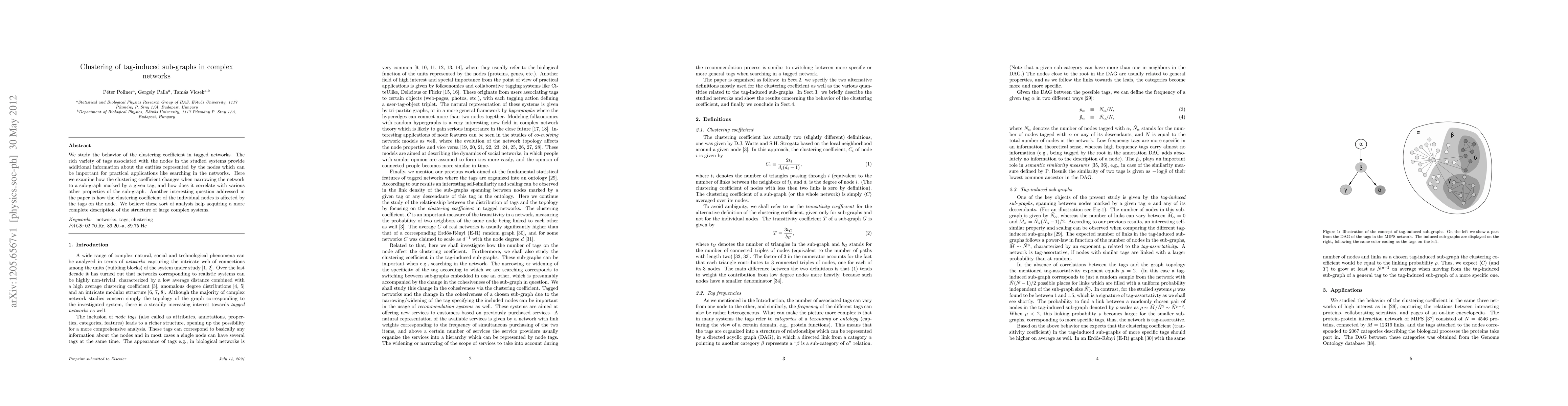 This paper investigates how the clustering coefficient in tagged networks changes when focusing on sub-graphs defined by specific tags, and explores the correlation between this coefficient and other sub-graph properties. It also examines how node tags influence individual node clustering coefficients, aiming to provide a deeper understanding of complex systems.