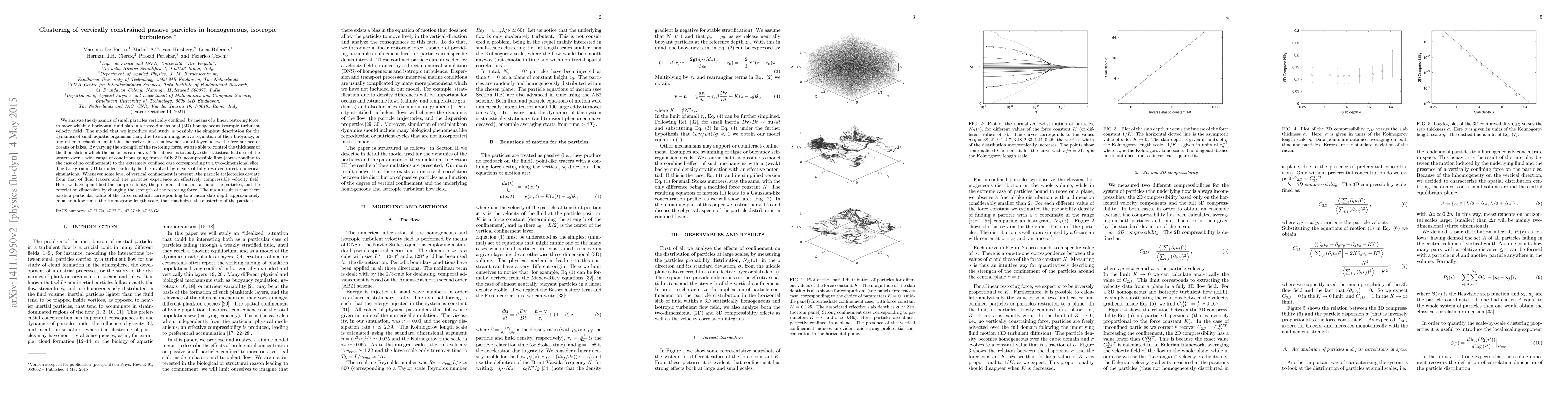 We analyze the dynamics of small particles vertically confined, by means of a linear restoring force, to move within a horizontal fluid slab in a three-dimensional (3D) homogeneous isotropic turbulent velocity field. The model that we introduce and study is possibly the simplest description for the dynamics of small aquatic organisms that, due to swimming, active regulation of their buoyancy, or any other mechanism, maintain themselves in a shallow horizontal layer below the free surface of oceans or lakes. By varying the strength of the restoring force, we are able to control the thickness of the fluid slab in which the particles can move. This allows us to analyze the statistical features of the system over a wide range of conditions going from a fully 3D incompressible flow (corresponding to the case of no confinement) to the extremely confined case corresponding to a two-dimensional slice. The background 3D turbulent velocity field is evolved by means of fully resolved direct numerical simulations. Whenever some level of vertical confinement is present, the particle trajectories deviate from that of fluid tracers and the particles experience an effectively compressible velocity field. Here, we have quantified the compressibility, the preferential concentration of the particles, and the correlation dimension by changing the strength of the restoring force. The main result is that there exists a particular value of the force constant, corresponding to a mean slab depth approximately equal to a few times the Kolmogorov length scale, that maximizes the clustering of the particles.