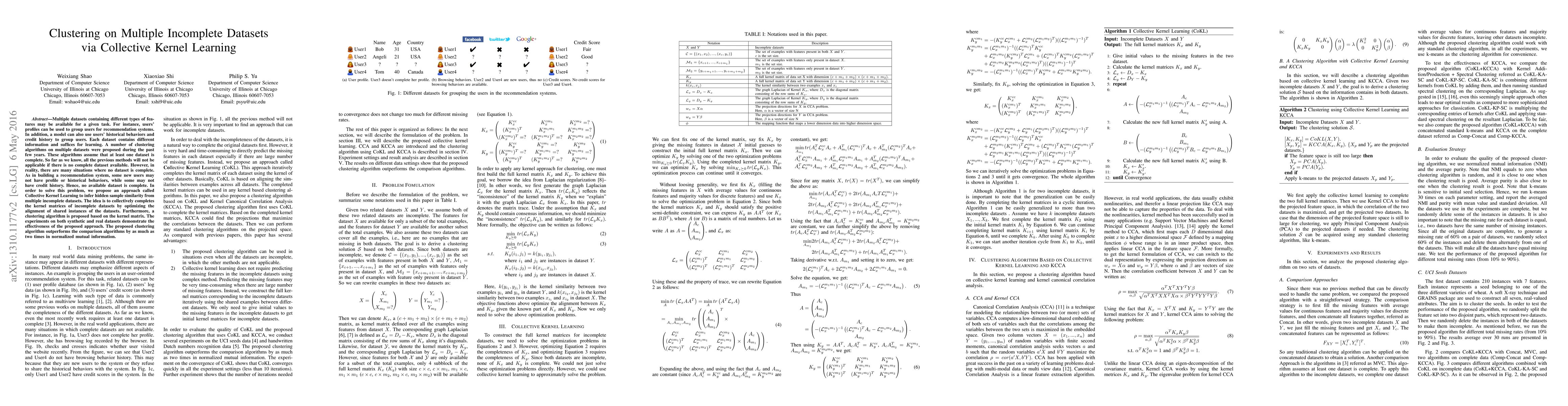 This paper proposes Collective Kernel Learning to cluster users from multiple incomplete datasets, addressing the issue where no dataset is complete. The method optimizes the alignment of shared instances across datasets to complete kernel matrices and introduces a clustering algorithm based on the kernel matrix, which outperforms existing methods by up to twice in normalized mutual information.