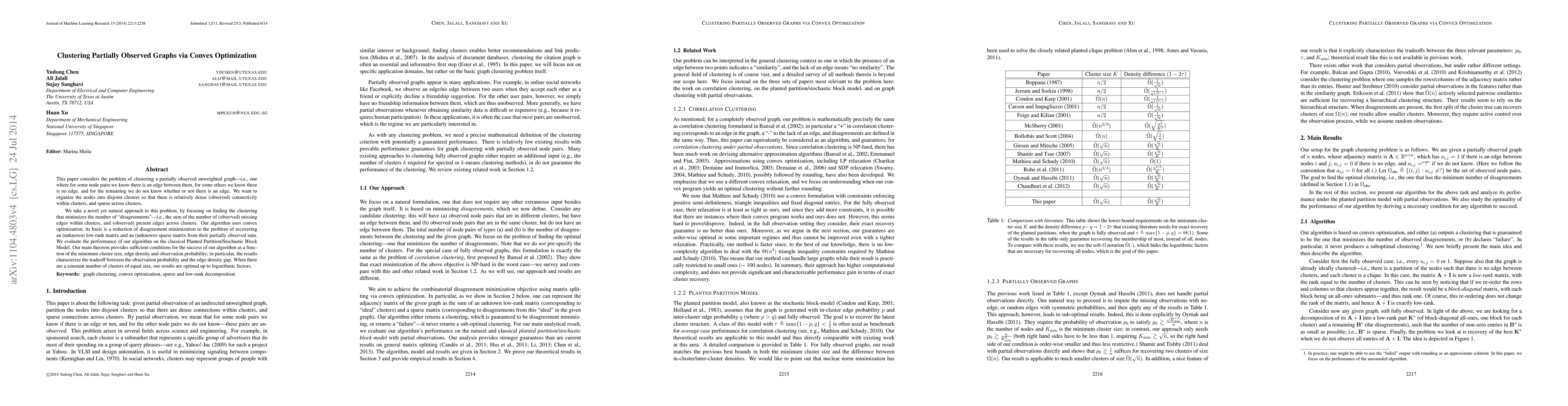 This paper considers the problem of clustering a partially observed unweighted graph---i.e., one where for some node pairs we know there is an edge between them, for some others we know there is no edge, and for the remaining we do not know whether or not there is an edge. We want to organize the nodes into disjoint clusters so that there is relatively dense (observed) connectivity within clusters, and sparse across clusters. We take a novel yet natural approach to this problem, by focusing on finding the clustering that minimizes the number of "disagreements"---i.e., the sum of the number of (observed) missing edges within clusters, and (observed) present edges across clusters. Our algorithm uses convex optimization; its basis is a reduction of disagreement minimization to the problem of recovering an (unknown) low-rank matrix and an (unknown) sparse matrix from their partially observed sum. We evaluate the performance of our algorithm on the classical Planted Partition/Stochastic Block Model. Our main theorem provides sufficient conditions for the success of our algorithm as a function of the minimum cluster size, edge density and observation probability; in particular, the results characterize the tradeoff between the observation probability and the edge density gap. When there are a constant number of clusters of equal size, our results are optimal up to logarithmic factors.
