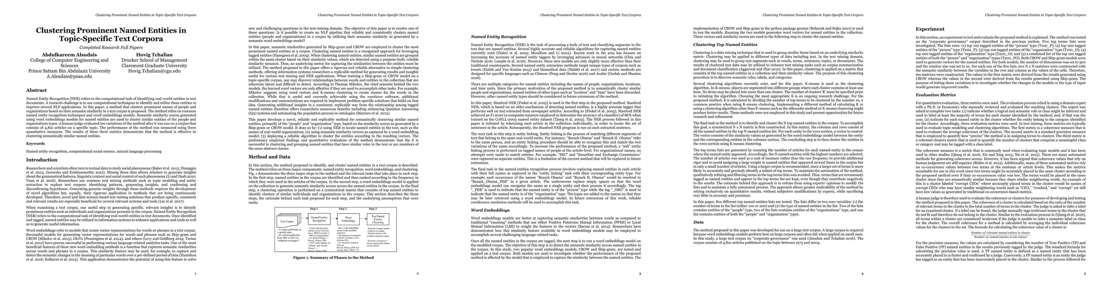 Named entities in text documents are the names of people, organization, location or other types of objects in the documents that exist in the real world. A persisting research challenge is to use computational techniques to identify such entities in text documents. Once identified, several text mining tools and algorithms can be utilized to leverage these discovered named entities and improve NLP applications. In this paper, a method that clusters prominent names of people and organizations based on their semantic similarity in a text corpus is proposed. The method relies on common named entity recognition techniques and on recent word embeddings models. The semantic similarity scores generated using the word embeddings models for the named entities are used to cluster similar entities of the people and organizations types. Two human judges evaluated ten variations of the method after it was run on a corpus that consists of 4,821 articles on a specific topic. The performance of the method was measured using three quantitative measures. The results of these three metrics demonstrate that the method is effective in clustering semantically similar named entities.
