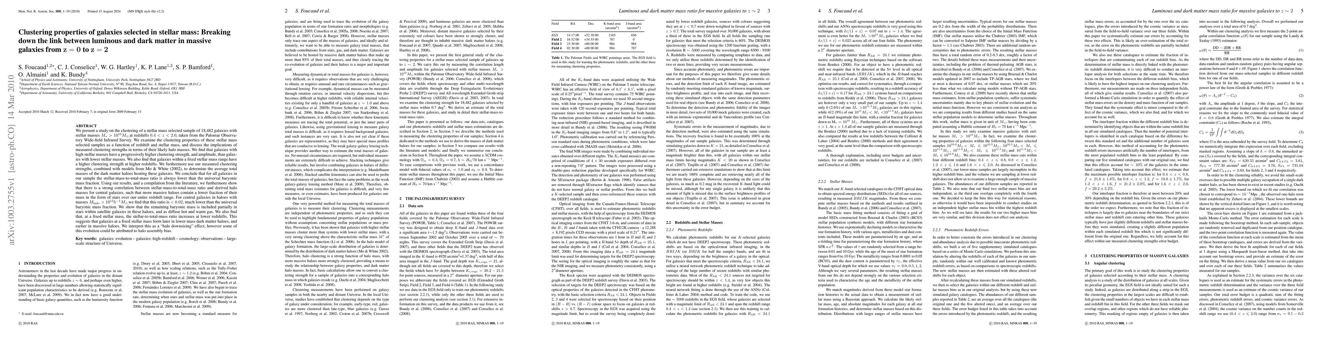 This study investigates the clustering of massive galaxies (stellar mass >10^10M(sun)) from z=0 to z=2, revealing a strong correlation between stellar mass and clustering strength. The research finds that galaxies with higher stellar masses reside in more massive dark matter haloes, with a decreasing stellar-to-total-mass ratio in more massive haloes, indicating a "halo downsizing" effect where galaxies form in progressively lower mass haloes over time.