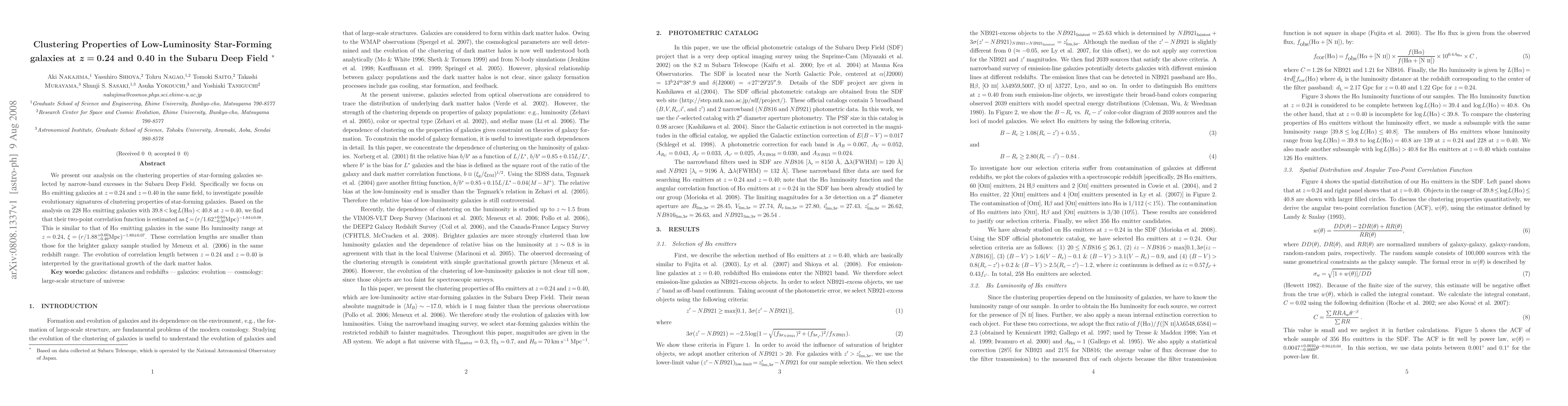 This study analyzes the clustering properties of low-luminosity Halpha-emitting star-forming galaxies at redshifts z = 0.24 and z = 0.40 in the Subaru Deep Field, finding similar two-point correlation functions for both redshifts, indicating minimal evolution in clustering properties over this period.