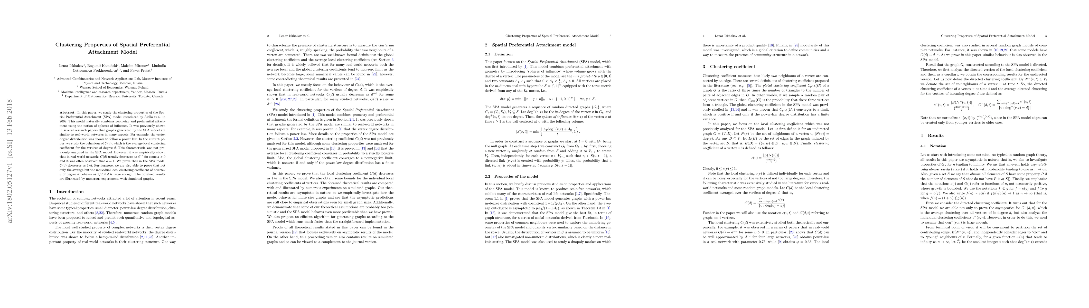 This paper investigates the clustering properties of the Spatial Preferential Attachment model, showing that the average local clustering coefficient C(d) decreases as 1/d for vertices of degree d, aligning with observations in real-world networks. Experimental results confirm these theoretical findings.