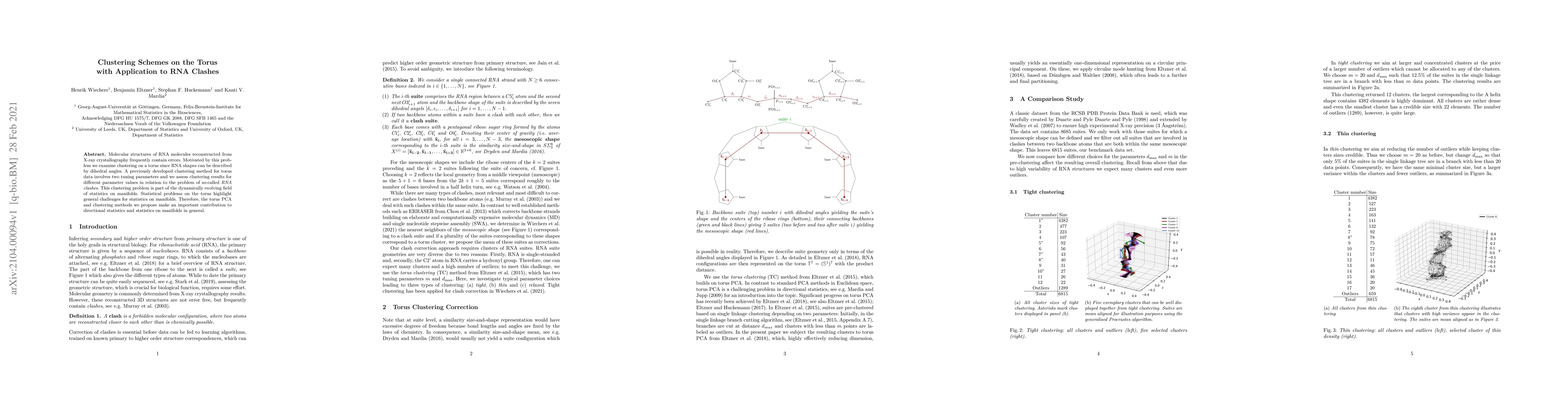 Molecular structures of RNA molecules reconstructed from X-ray crystallography frequently contain errors. Motivated by this problem we examine clustering on a torus since RNA shapes can be described by dihedral angles. A previously developed clustering method for torus data involves two tuning parameters and we assess clustering results for different parameter values in relation to the problem of so-called RNA clashes. This clustering problem is part of the dynamically evolving field of statistics on manifolds. Statistical problems on the torus highlight general challenges for statistics on manifolds. Therefore, the torus PCA and clustering methods we propose make an important contribution to directional statistics and statistics on manifolds in general.
