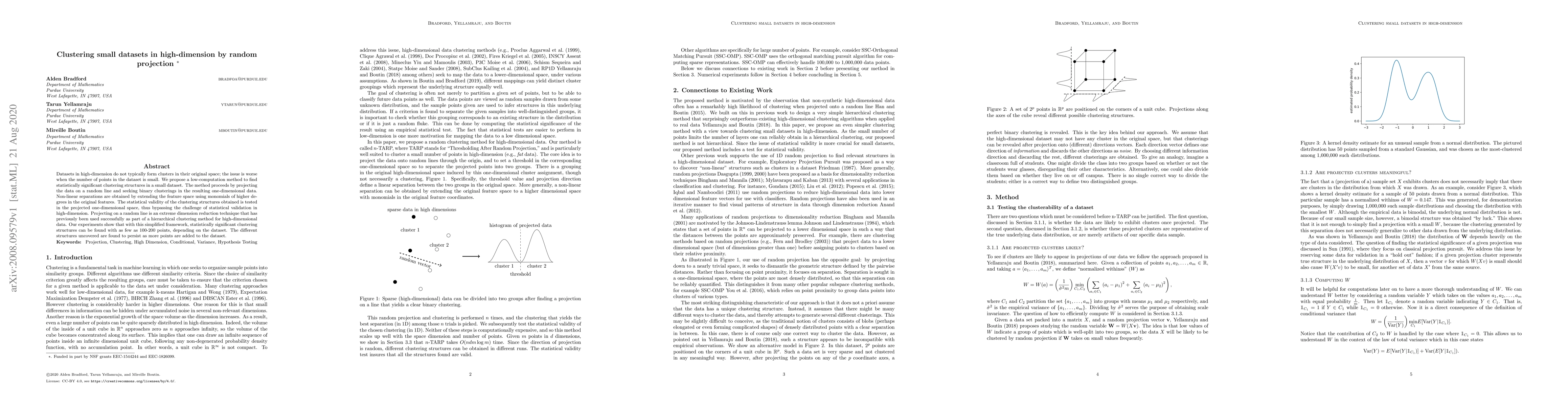 Datasets in high-dimension do not typically form clusters in their original space; the issue is worse when the number of points in the dataset is small. We propose a low-computation method to find statistically significant clustering structures in a small dataset. The method proceeds by projecting the data on a random line and seeking binary clusterings in the resulting one-dimensional data. Non-linear separations are obtained by extending the feature space using monomials of higher degrees in the original features. The statistical validity of the clustering structures obtained is tested in the projected one-dimensional space, thus bypassing the challenge of statistical validation in high-dimension. Projecting on a random line is an extreme dimension reduction technique that has previously been used successfully as part of a hierarchical clustering method for high-dimensional data. Our experiments show that with this simplified framework, statistically significant clustering structures can be found with as few as 100-200 points, depending on the dataset. The different structures uncovered are found to persist as more points are added to the dataset.
