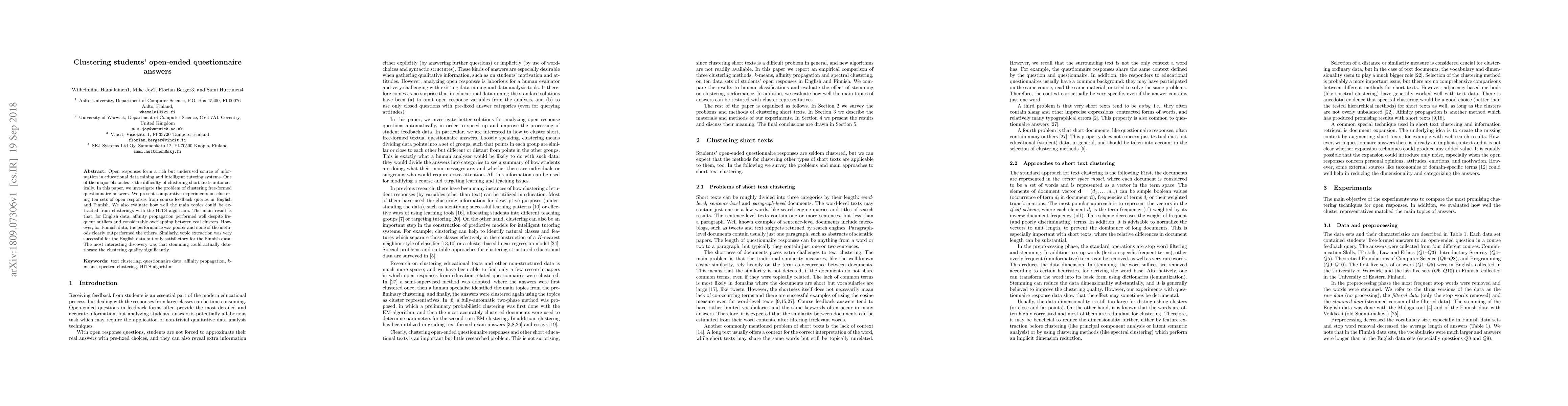 Open responses form a rich but underused source of information in educational data mining and intelligent tutoring systems. One of the major obstacles is the difficulty of clustering short texts automatically. In this paper, we investigate the problem of clustering free-formed questionnaire answers. We present comparative experiments on clustering ten sets of open responses from course feedback queries in English and Finnish. We also evaluate how well the main topics could be extracted from clusterings with the HITS algorithm. The main result is that, for English data, affinity propagation performed well despite frequent outliers and considerable overlapping between real clusters. However, for Finnish data, the performance was poorer and none of the methods clearly outperformed the others. Similarly, topic extraction was very successful for the English data but only satisfactory for the Finnish data. The most interesting discovery was that stemming could actually deteriorate the clustering quality significantly.