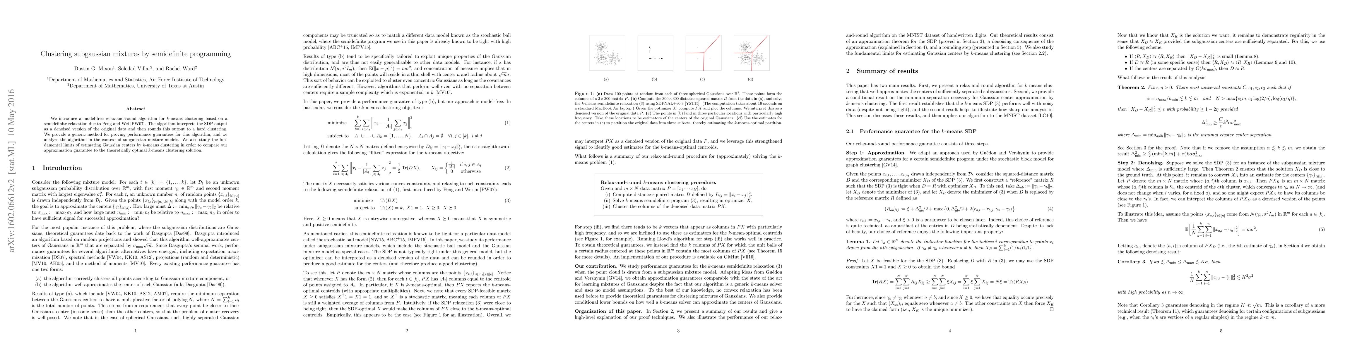 A new algorithm for k-means clustering uses semidefinite programming to relax and round the original data, providing a model-free method for clustering subgaussian mixtures with improved performance guarantees.