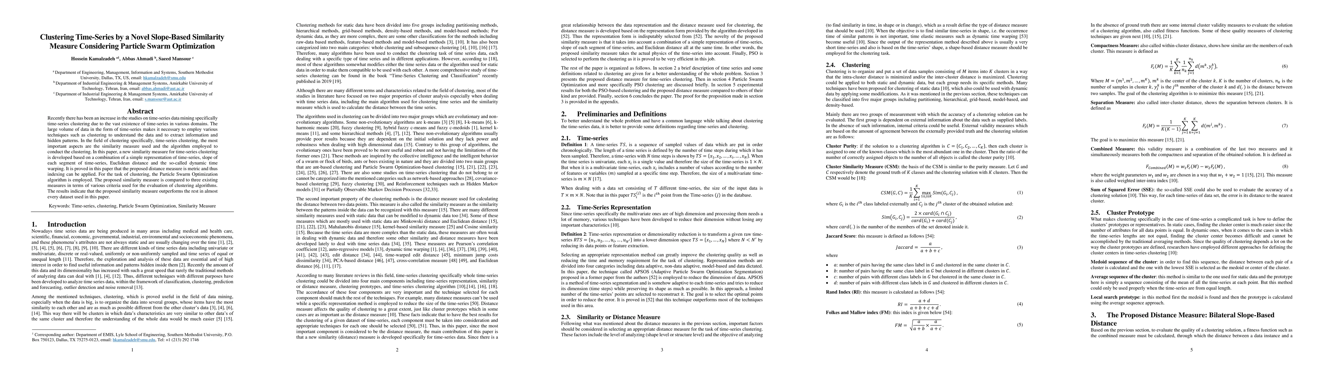 This paper introduces a novel slope-based similarity measure for time-series clustering, combining segment slopes, Euclidean distance, and dynamic time warping. It employs Particle Swarm Optimization for clustering and demonstrates superior performance over three existing measures in various datasets.