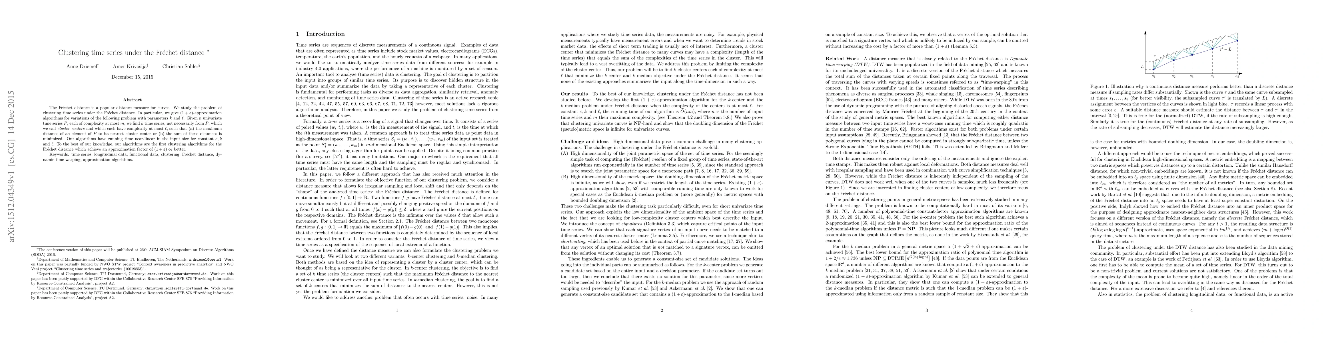 The Fr\'echet distance is a popular distance measure for curves. We study the problem of clustering time series under the Fr\'echet distance. In particular, we give $(1+\varepsilon)$-approximation algorithms for variations of the following problem with parameters $k$ and $\ell$. Given $n$ univariate time series $P$, each of complexity at most $m$, we find $k$ time series, not necessarily from $P$, which we call \emph{cluster centers} and which each have complexity at most $\ell$, such that (a) the maximum distance of an element of $P$ to its nearest cluster center or (b) the sum of these distances is minimized. Our algorithms have running time near-linear in the input size for constant $\varepsilon$, $k$ and $\ell$. To the best of our knowledge, our algorithms are the first clustering algorithms for the Fr\'echet distance which achieve an approximation factor of $(1+\varepsilon)$ or better. Keywords: time series, longitudinal data, functional data, clustering, Fr\'echet distance, dynamic time warping, approximation algorithms.