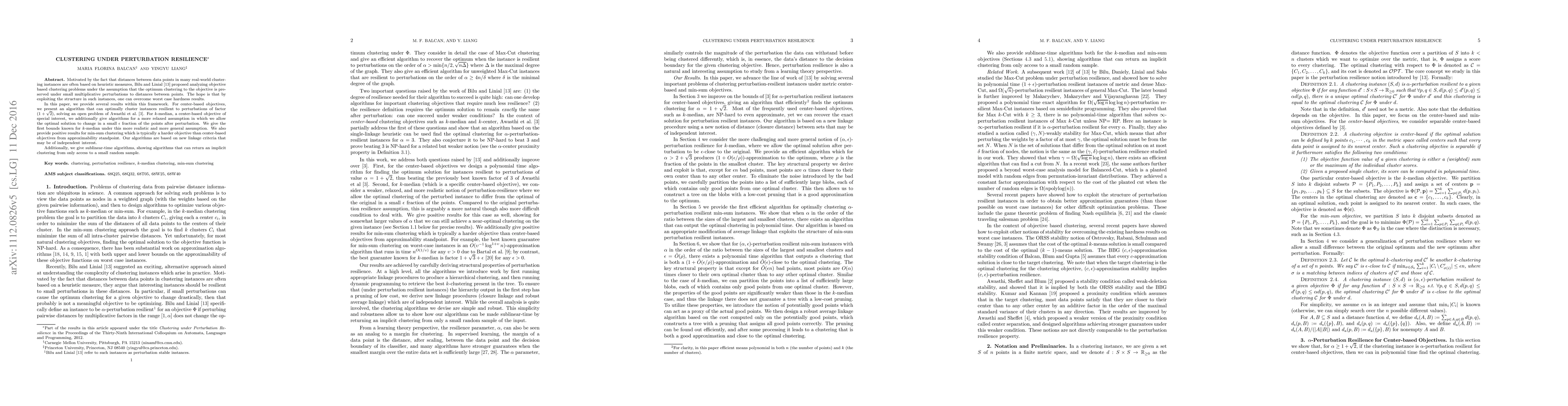 This paper explores clustering under perturbation resilience, focusing on maintaining optimal clustering despite small multiplicative changes in distance measures. It presents algorithms for center-based objectives and $k$-median, offering solutions for both strict and relaxed perturbation assumptions, and introduces new linkage criteria for clustering. Additionally, it provides sublinear-time algorithms for implicit clustering from random samples.